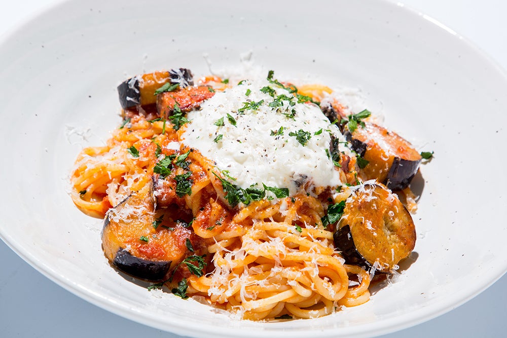【トマトソース】フレッシュモッツァレラチーズと「農家のベーコン」、茄子のトマトソース 1190円(税込)