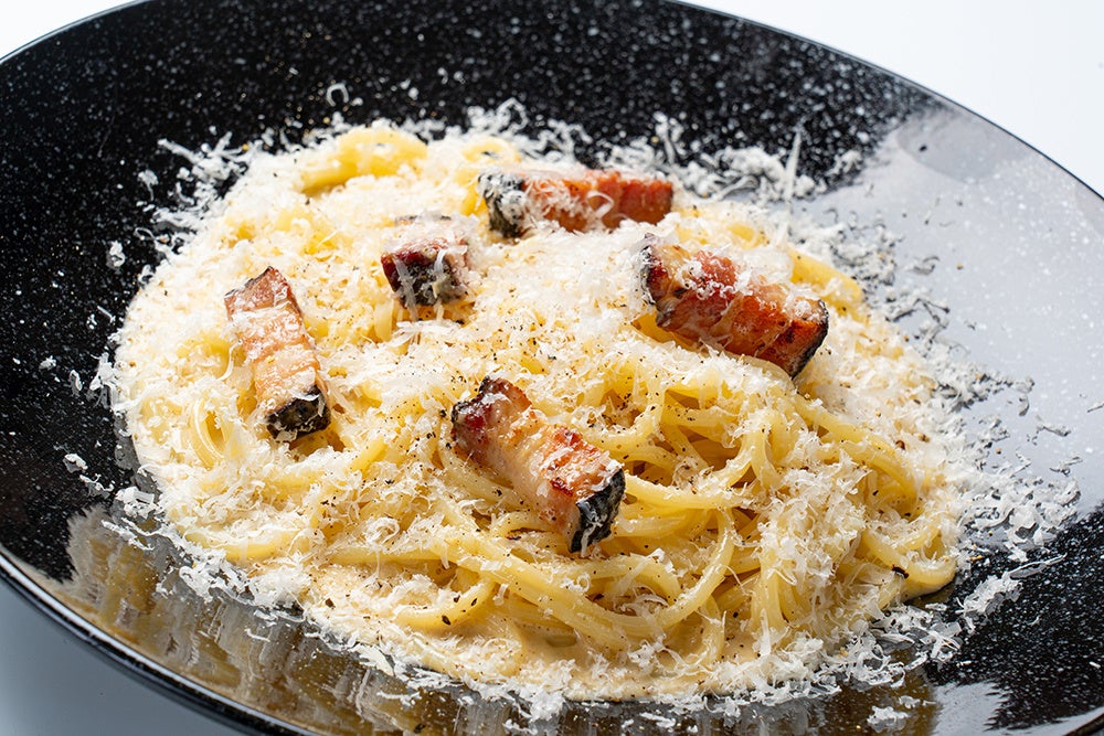 【クリームソース】ふわふわチーズがたっぷり!北海道カルボナーラ 1090円(税込)北海道のブランド卵「下川六〇酵素卵」と北海道の生クリームでつくる「ザ・北海道生パスタ」メニュー。