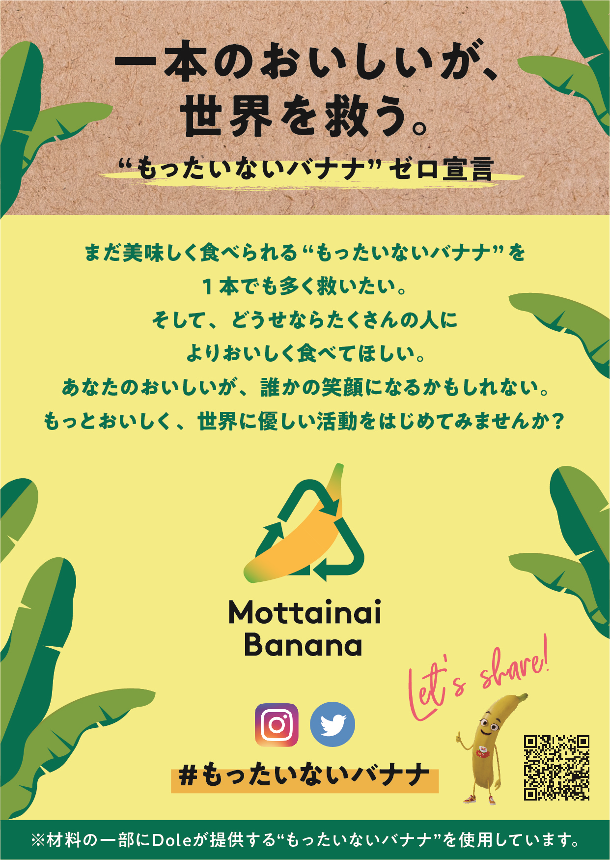ドールでは、「持続可能な開発目標(SDGs)」の実現に向け、『もったいないバナナ』プロジェクトを推進しております。まだ美味しく食べられるにも関わらず、流通過程における様々な要因により、捨てざるを得ない廃棄バナナを「もったいないバナナ」として、そのようなバナナをゼロにすることを目指しております。