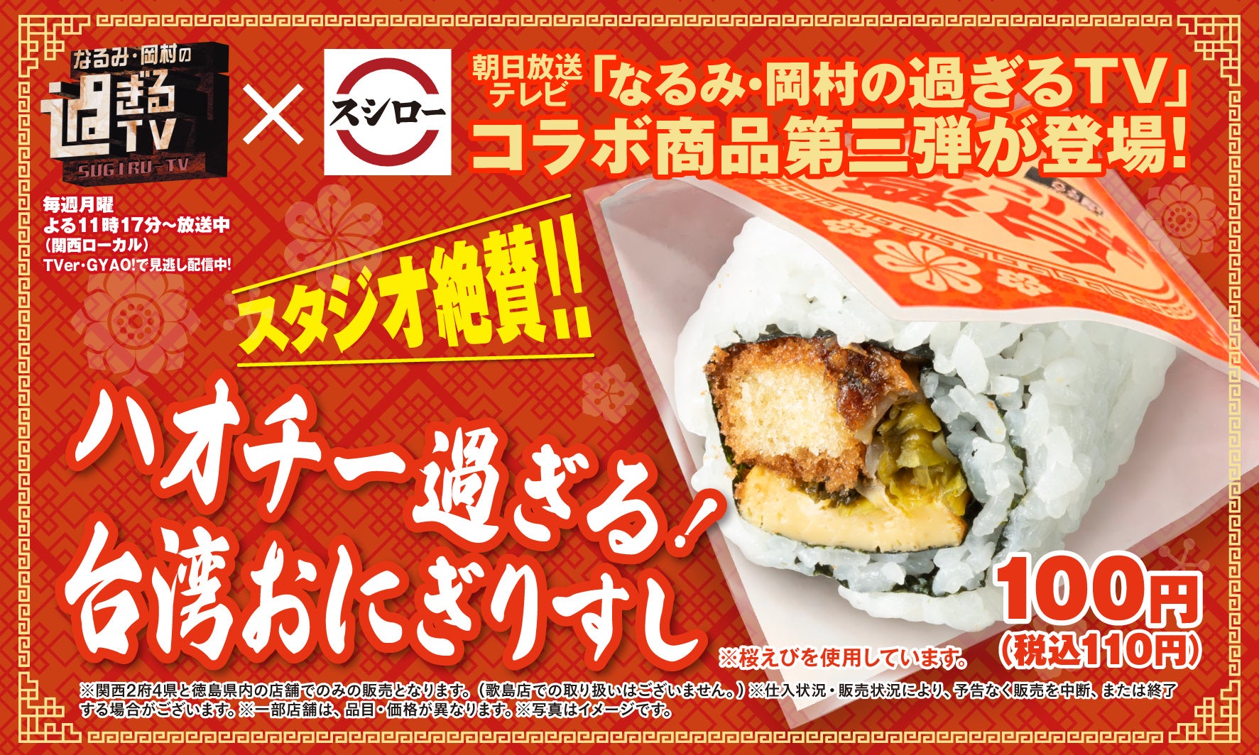 株式会社あきんどスシロー(本社:大阪府吹田市、代表取締役社長:堀江 陽)は、朝日放送テレビ“なるみ・岡村の過ぎるTV”と共同開発した新商品「ハオチー過ぎる!台湾おにぎりすし」100円(税込110円)を、本日3月29日(火)より、関西2府4県と徳島県のスシロー店舗(※)にて期間限定で販売いたします。 ※歌島店、スシロー To Goでのお取り扱いはございません。