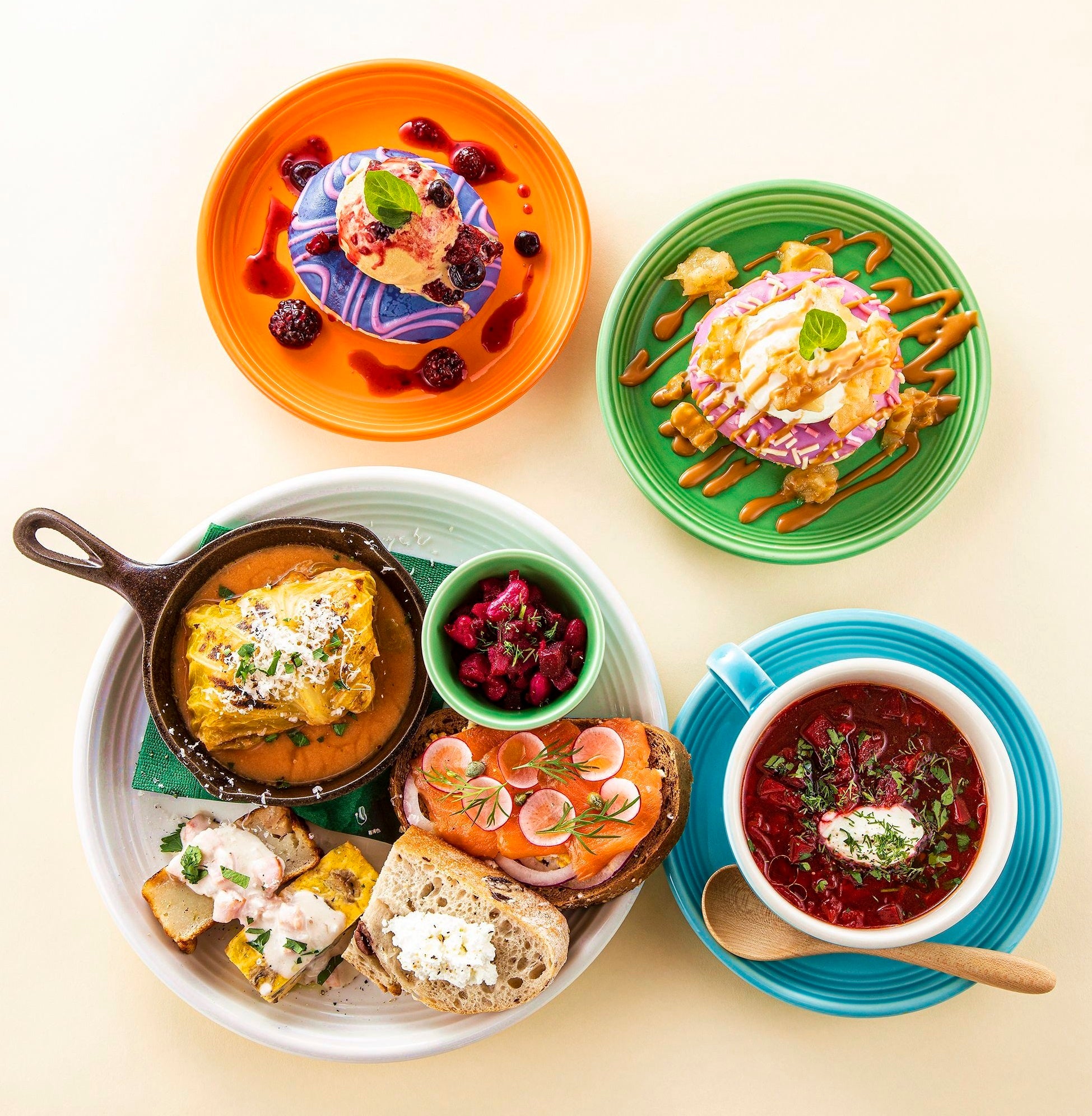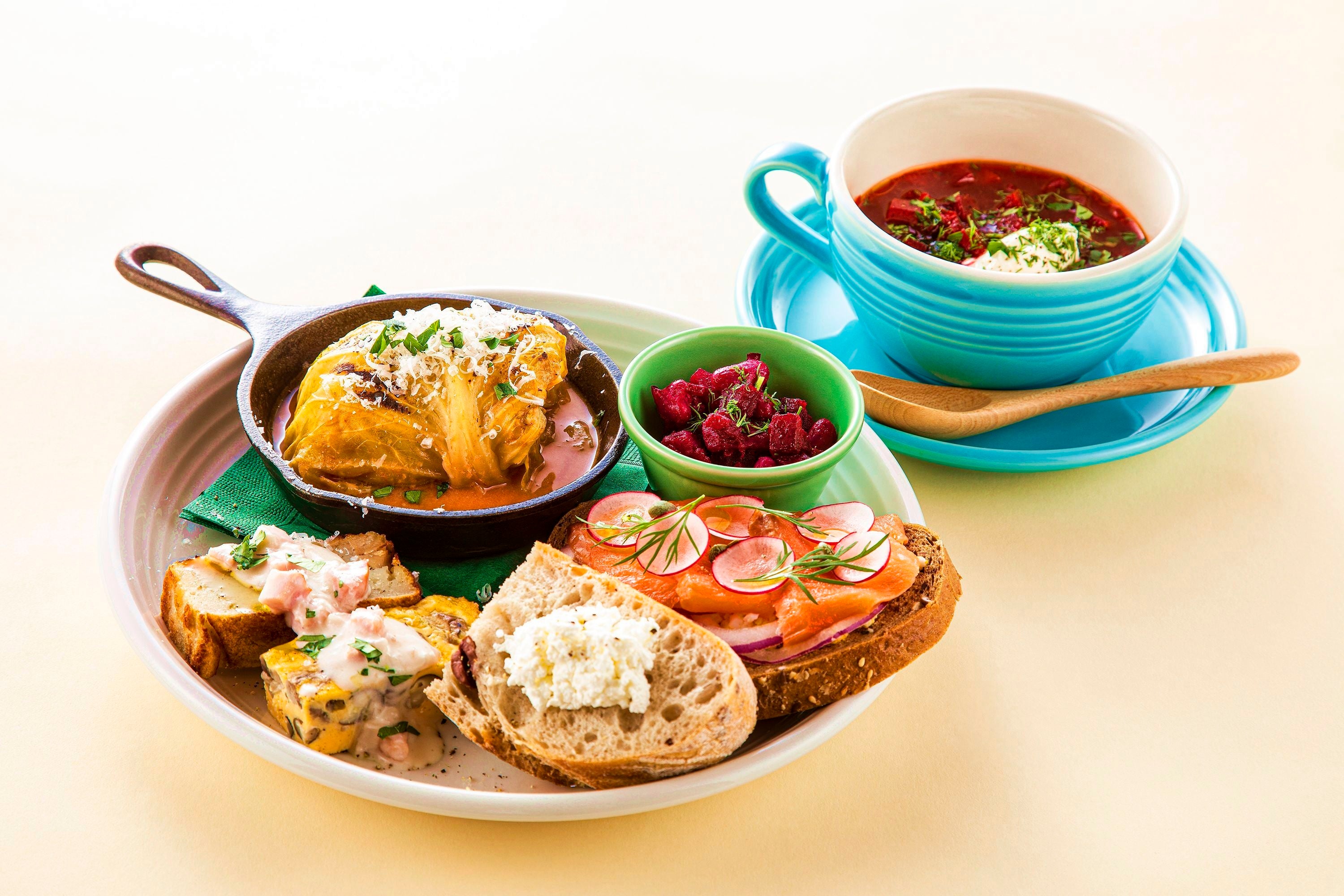 今回、プロジェクト第1弾として、リトアニアの郷土料理をイメージしたワンプレートメニューを、4月4日(月)~5月15日(日)の期間限定で販売いたします。リトアニア共和国直輸入のヨーロピアンブレッドを使ったオープンサンドや、リトアニア伝統の焼きロールキャベツ、リトアニアでよく使われる食材のビーツ、じゃがいも、キノコ、ディルのほか、リトアニアの食卓に欠かせないサワークリーム、カッテージチーズなどの乳製品をアクセントに取り入れたワンプレートメニュー。同じくリトアニア直輸入のもっちりとした食感のドーナツを使用した、2種のデザートメニュー、計3品を展開します。2022年は日本とリトアニアの友好100周年。見た目も、味も北欧の香り漂うリトアニアメニューを是非、ご賞味ください。