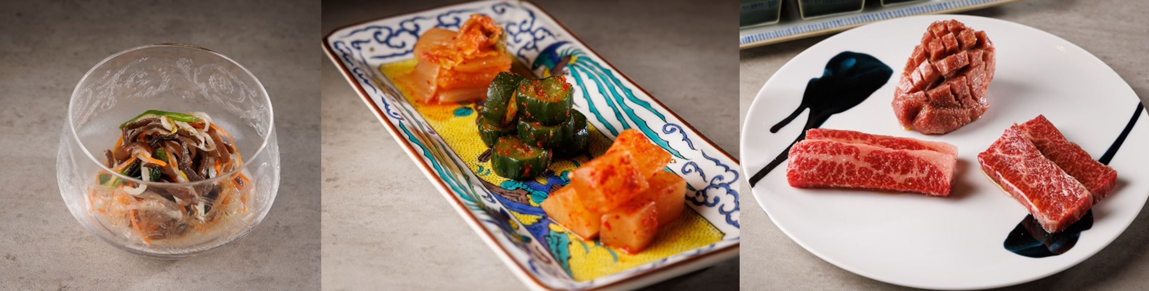 | 【前菜】 【焼物(タレ)】 ①五色野菜のナムル ⑧~⑩特選赤身肉3種 ②キムチ盛り合わせ 【焼物(塩)】 【〆の一品】 |