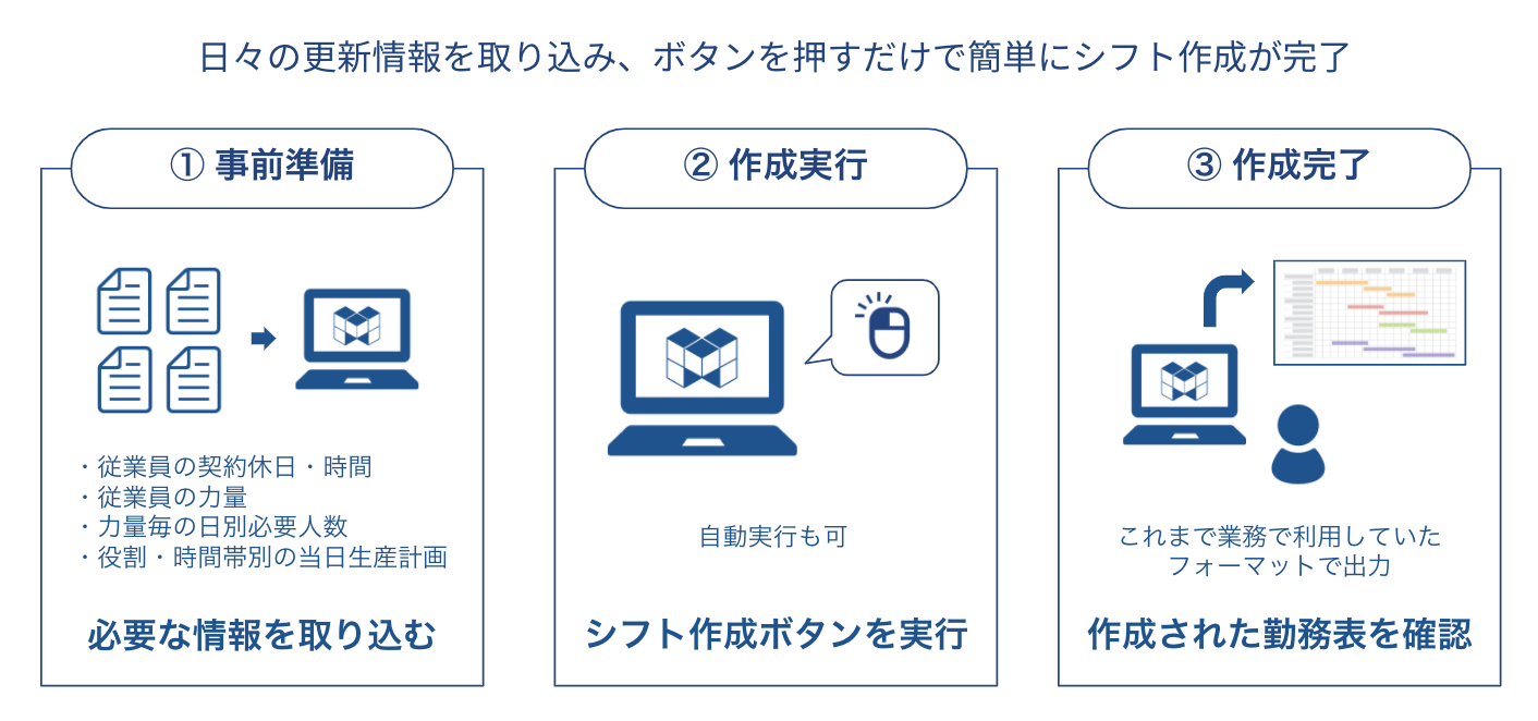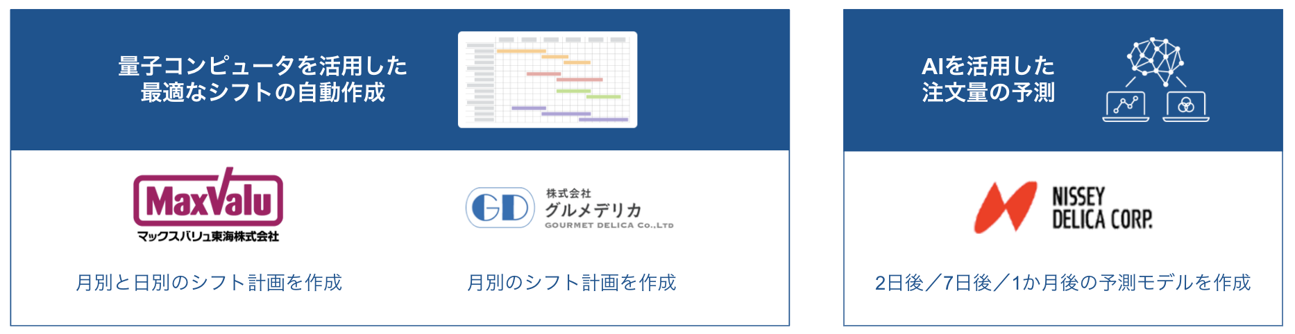 このほど、マックスバリュ東海株式会社(本社:静岡県浜松市、代表取締役社長:神尾啓治)と株式会社グルメデリカ(本社:埼玉県所沢市、代表取締役社長:関口繁幸)で、シフト作成システムの現場運用を開始したことをお知らせします。また、株式会社ニッセーデリカ(本社:東京都千代田区、代表取締役社長:川手康正)では、注文量予測モデルの活用に取り組んでいます。