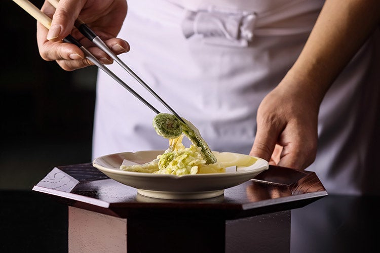 5月6日(金)まで提供のお品書きでは、土筆、菜の花、蕨、若筍、蕗、木の芽、こごみ等、春の喜び溢れる食材を彩り豊かに盛り込んでいます。
