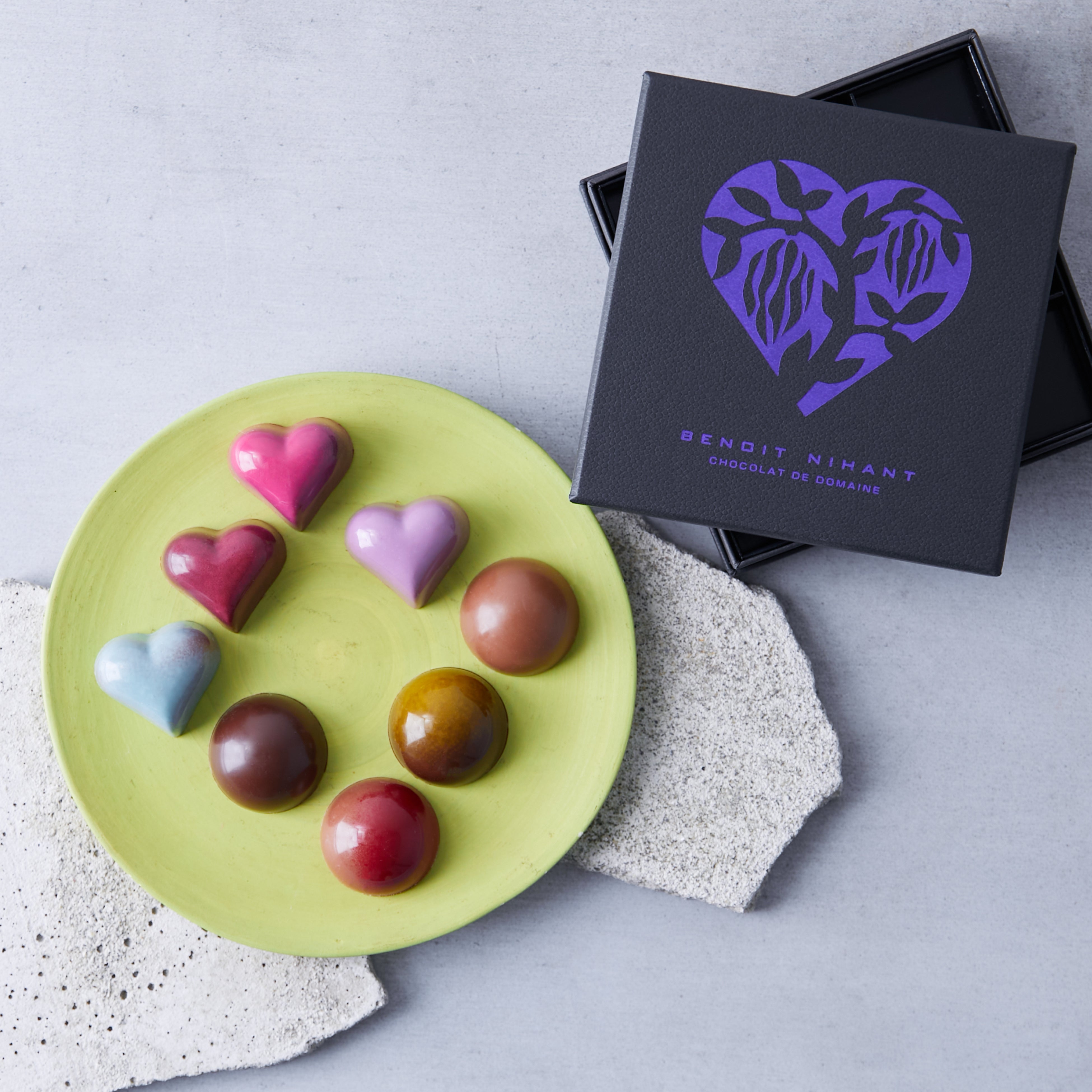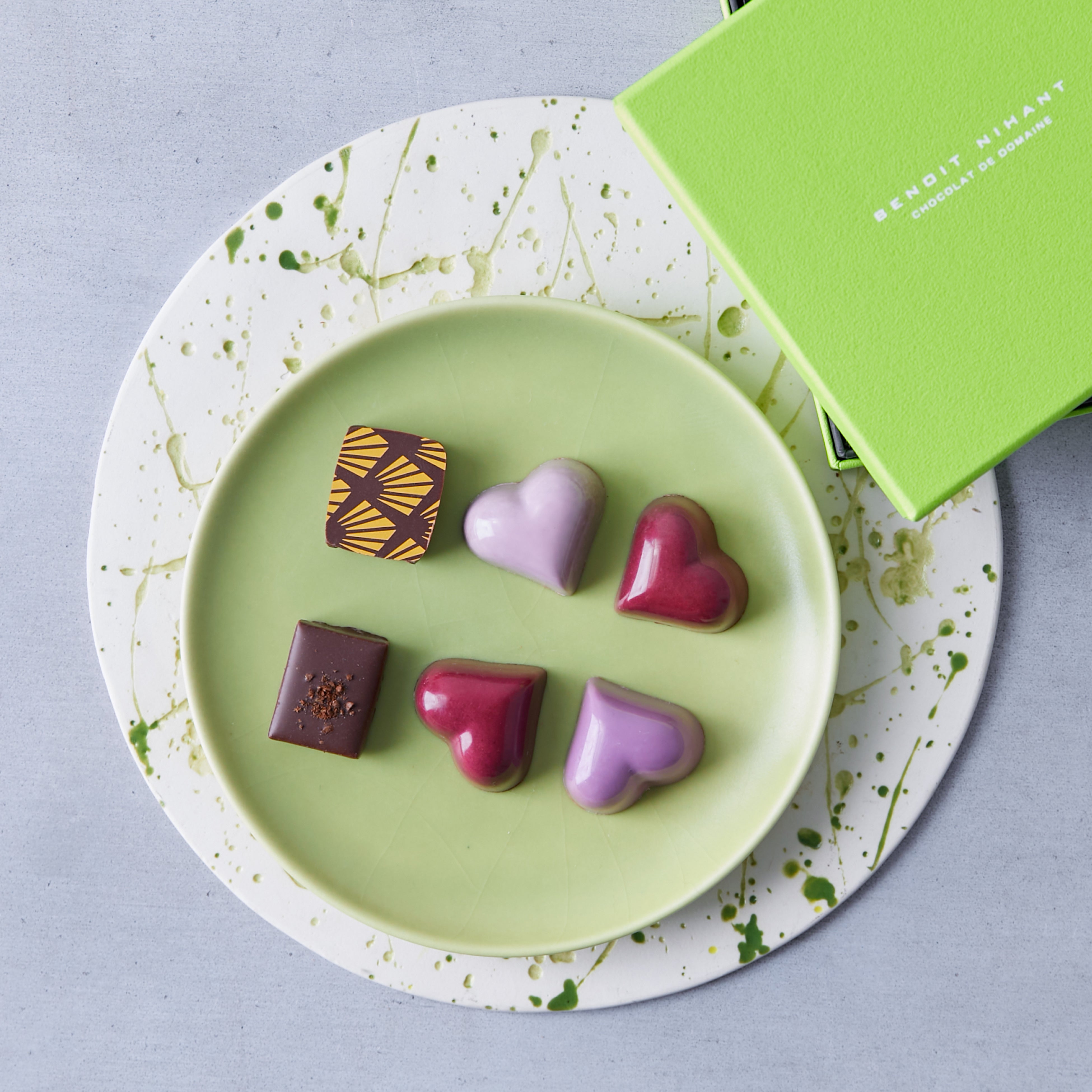 「ピンク コネクション」は ドミニカ産のカカオを使用し、香ばしく、ローストしたアーモンドとココナッツの風味やサクサクの食感を楽しめるチョコレートとなり、ピンク色のハート型に詰めた見た目にも鮮やかな逸品です。産地別カカオを楽しめる、ブノワニアンを味わったことのない初めての方におすすめの商品です。