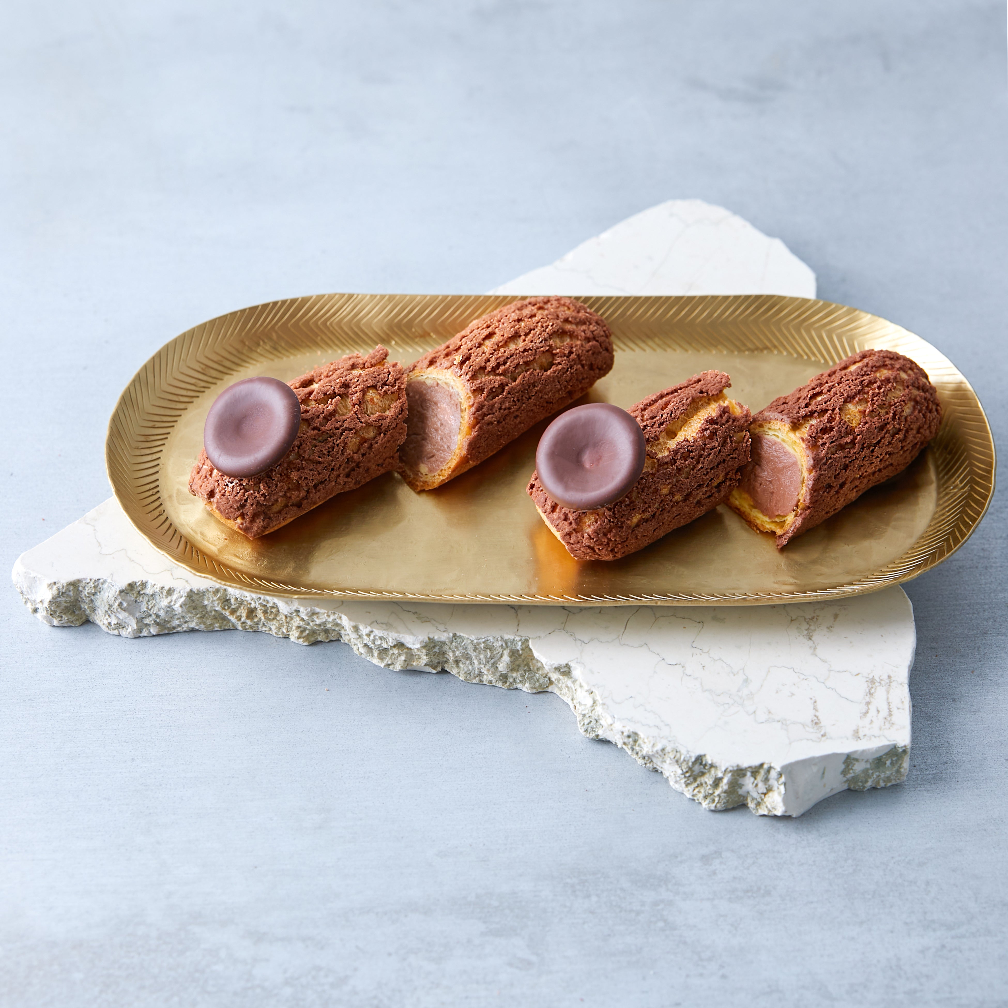 クラシックなケーキにクッキー生地をトッピングしたサクサク食感。あっさりとしたカスタードに、産地別チョコレートを練りこみチョコレートの風味を引き立てたエクレアです。