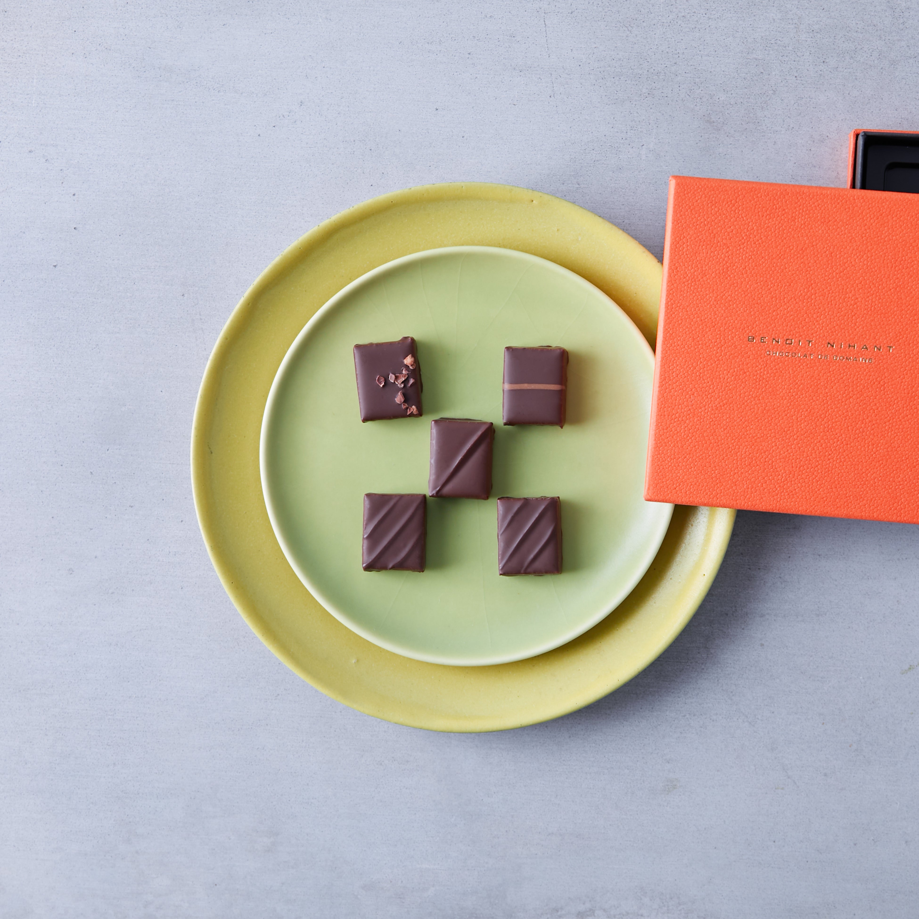 コーヒーの粒感があり、スパイスを感じるドミニカ産の力強いチョコレートに負けないフレーバー。「キャラメルサレ」はフルールドセルを練りこんだキャラメル入りガナッシュにドミニカ産カカオのスパイシーさがマッチ。春を感じるアソートボックスです。
