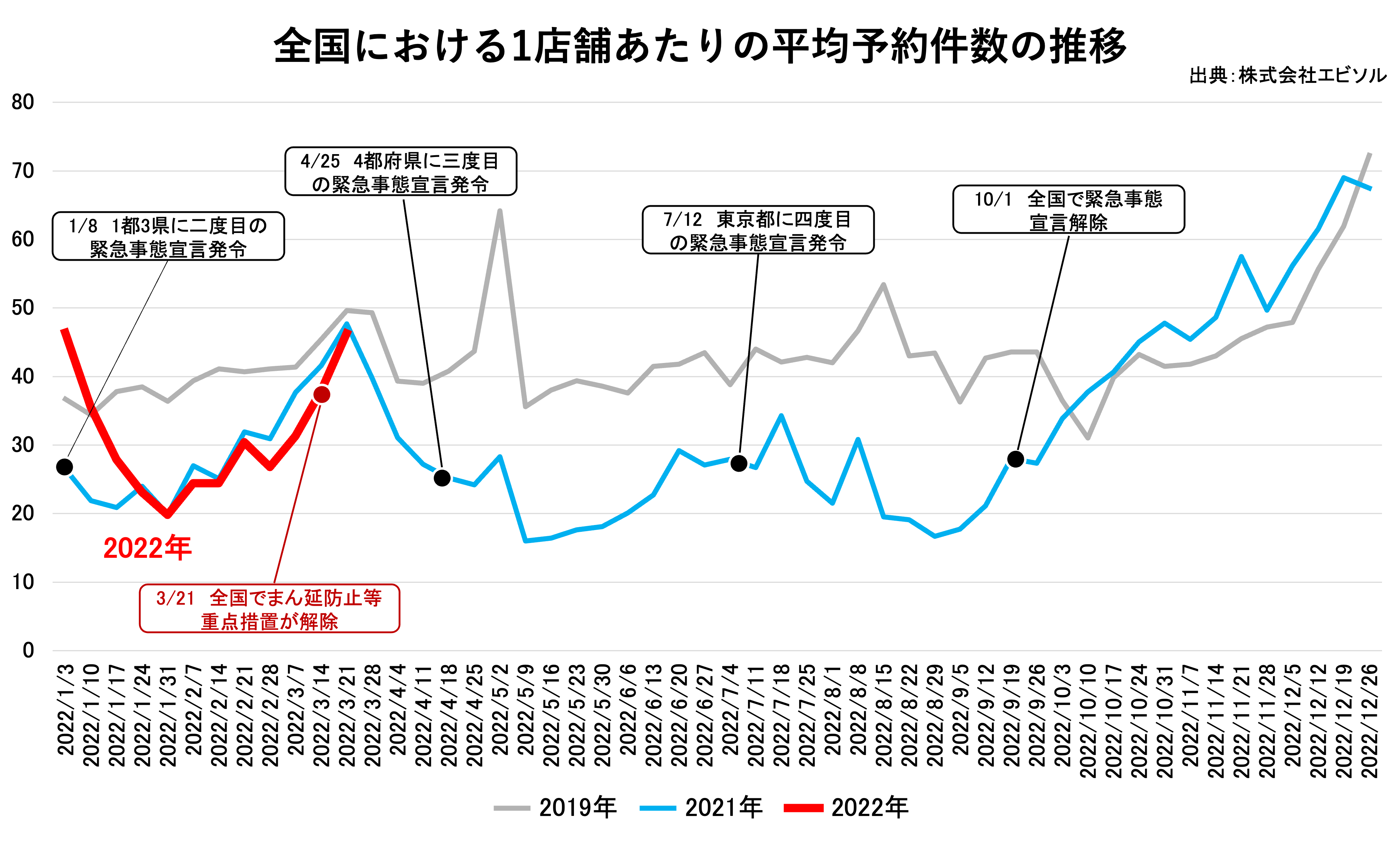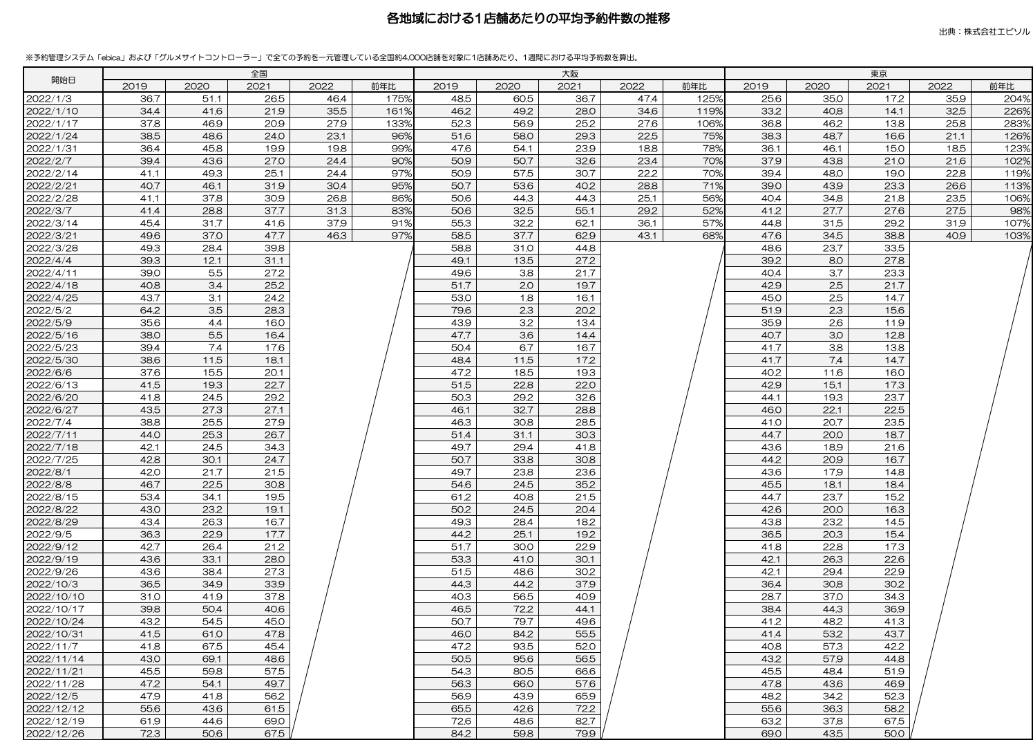 飲食店向け予約管理システム「ebica」を運営する株式会社エビソル(本社:東京都渋谷区、代表取締役:田中 宏彰、以下、エビソル)は、新型コロナウイルス感染症の拡大防止策に伴い大幅に自粛営業を余儀なくされている飲食店の厳しい状況を知っていただくことを目的に、飲食店の前年対比の予約状況(※1)を公開しております。本日は、新たに2022年3月1日〜3月27日の4週間分を更新した2022年3月度のレポートを公開します。
