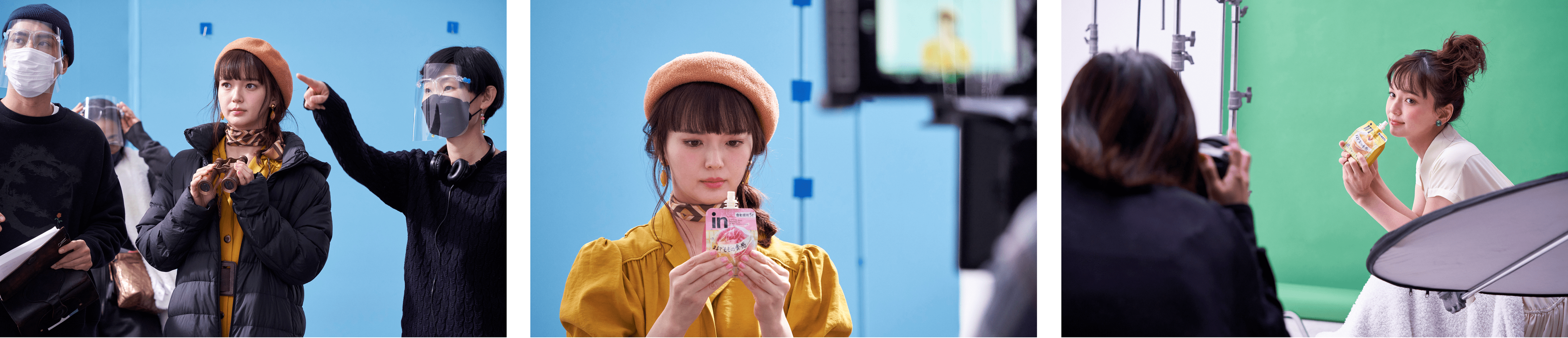 まるで果実そのもののような食感が魅力の「inゼリー フルーツ食感」を飲んで、驚きの表情を魅せる姿が印象的な本TV-CM。実際にinゼリーを飲むシーンでは、スタッフからも「可愛い~!」と思わず声が漏れるほどの魅力的な表情を連発されていました。さらに、「こんなに果実でin(いいん)ですか!」と驚きの表情を見せるシーンでは、監督からの「びっくりした表情で」「セリフの“in”の部分を強調して」という細かいオーダーにも笑顔で対応。振り返り際にピタッと止まってポーズを決めるシーンでは多部さんは「(ぴったり停止)出来るかな…」と不安げではあったものの、本番ではビシッとポーズを決め、スタッフも「ばっちりです!」と感嘆の声が湧き上がりました。多部さんも嬉しそうな表情を浮かべ、終始和やかな雰囲気で撮影が進みました。