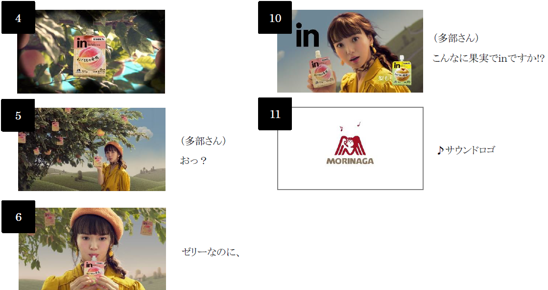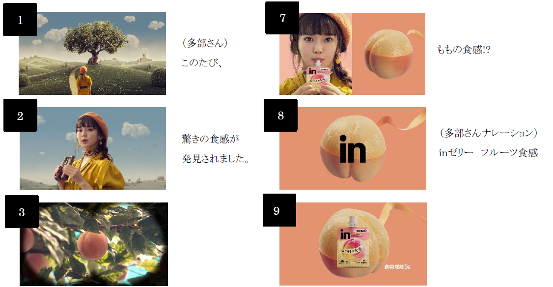 ふしぎな果実の樹があるとの噂を聞きつけて、となりまちに暮らす好奇心旺盛な女性(多部未華子さん)が樹を探しにくるシーンからCMがスタートします。多部さんがそれらしき樹を発見し、双眼鏡をのぞいてみると・・・樹になっていたのは「桃」ではなく「inゼリー フルーツ食感」。いてもいられなくなった多部さんが、さっそく樹からもいで飲んでみると、その食感は、なんとたしかにまるで桃!これは果実か。はたまたゼリーか。と多部さんが驚きの表情を魅せるCMです。