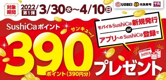 寿司レストランチェーンを展開する元気寿司株式会社(本社:栃木県宇都宮市 代表取締役社長 法師人尚史)は、2022年3月30日(水)~4月10日(日)及び4月18日(月)~4月28日(木)の期間限定で、「SushiCaポイント390ポイントプレゼントキャンペーン!」を開催いたします。まだSushiCaをお持ちでない方やお持ちのSushiCaカードのアプリ未登録の方は、この期間中に是非モバイルSushiCaの新規発行、またはアプリへの登録で、お得なポイントをゲットしてください!