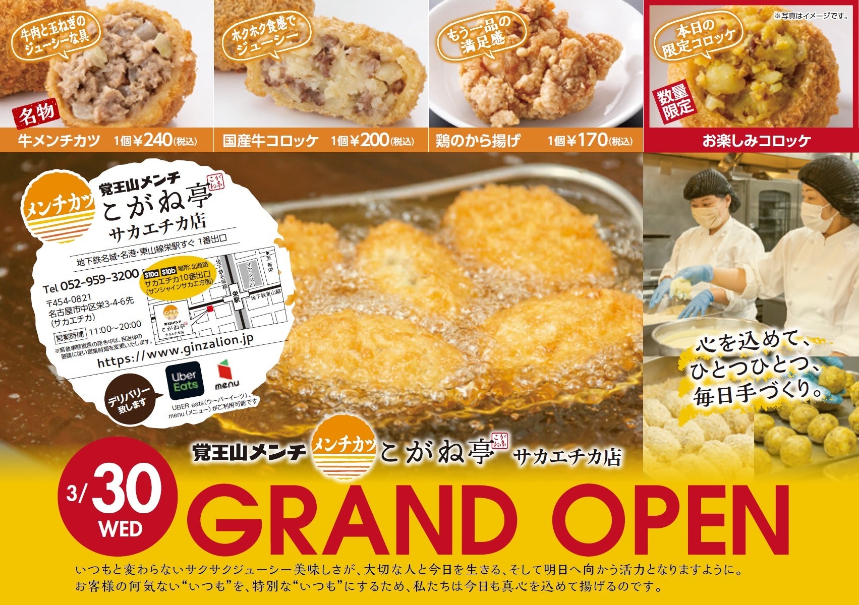 カラッと揚げたメンチカツの黄金色から名付けられた「覚王山メンチ こがね亭」は、老舗ビヤホール「銀座ライオン」のノウハウを詰めたメンチカツ・コロッケのテイクアウト専門店です。覚王山メンチ こがね亭 覚王山店が人気をよび、今回地下鉄栄駅直結のサカエチカ内に登場です。