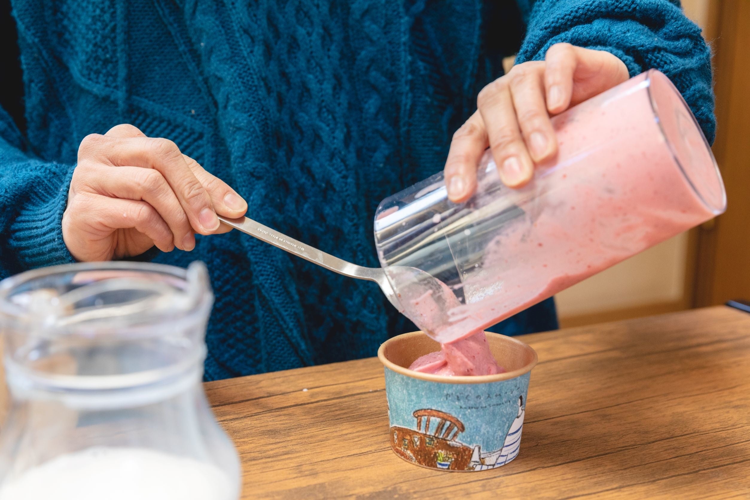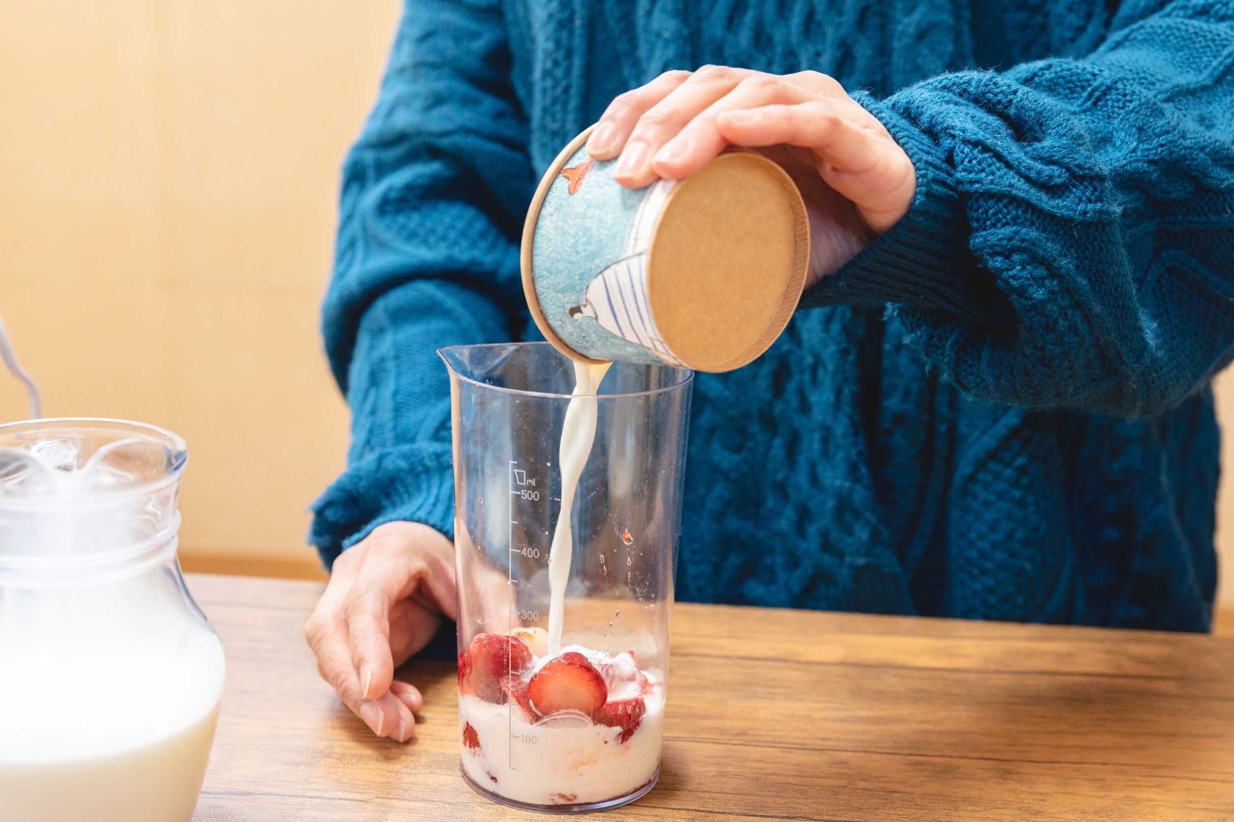 この時、牛乳は「かぞくのスムージー」のカップに約半分。目分量でOK。