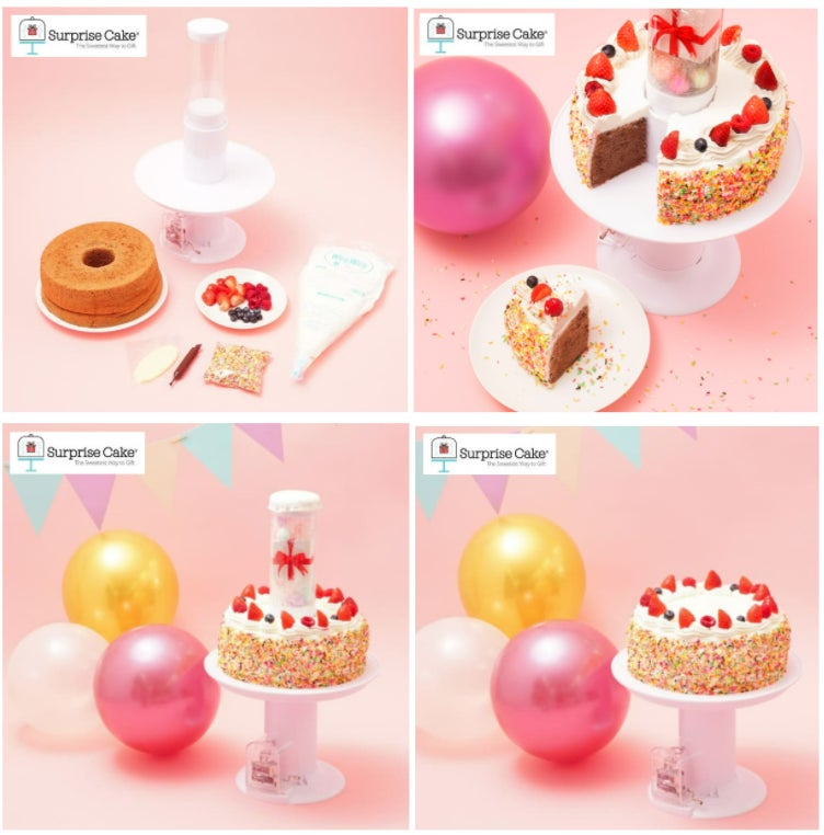 基本の材料は全てセットになっており、組み立ても簡単です。専用の容器にプレゼント※を入れて密閉することができ、ケーキスタンドにプレゼントをセット後、お客様自身で仕上げのデコレーションを施します。付属の材料に加え、お好みのフルーツやお菓子などをデコレーションすることで、世界に一つだけのオリジナルケーキが完成。オルゴールの音色と共にプレゼントが中から飛び出す演出が可能です。ご家族やご友人の誕生日などのパーティーにぜひご利用ください。