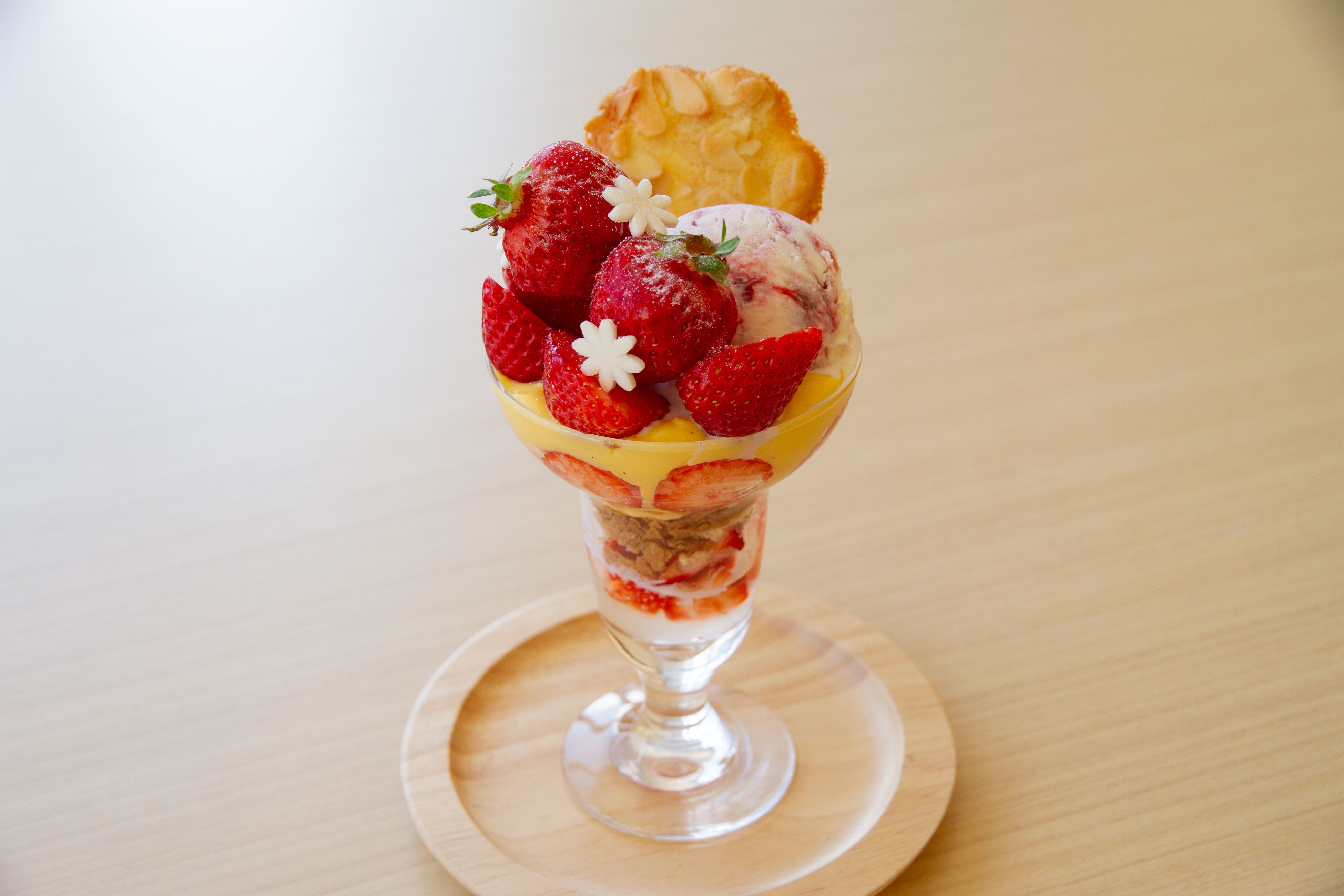 自家製カスタードクリームやストロベリーアイスにたっぷりの苺。食べ進めるたびワクワクが止まらない苺のパフェです。