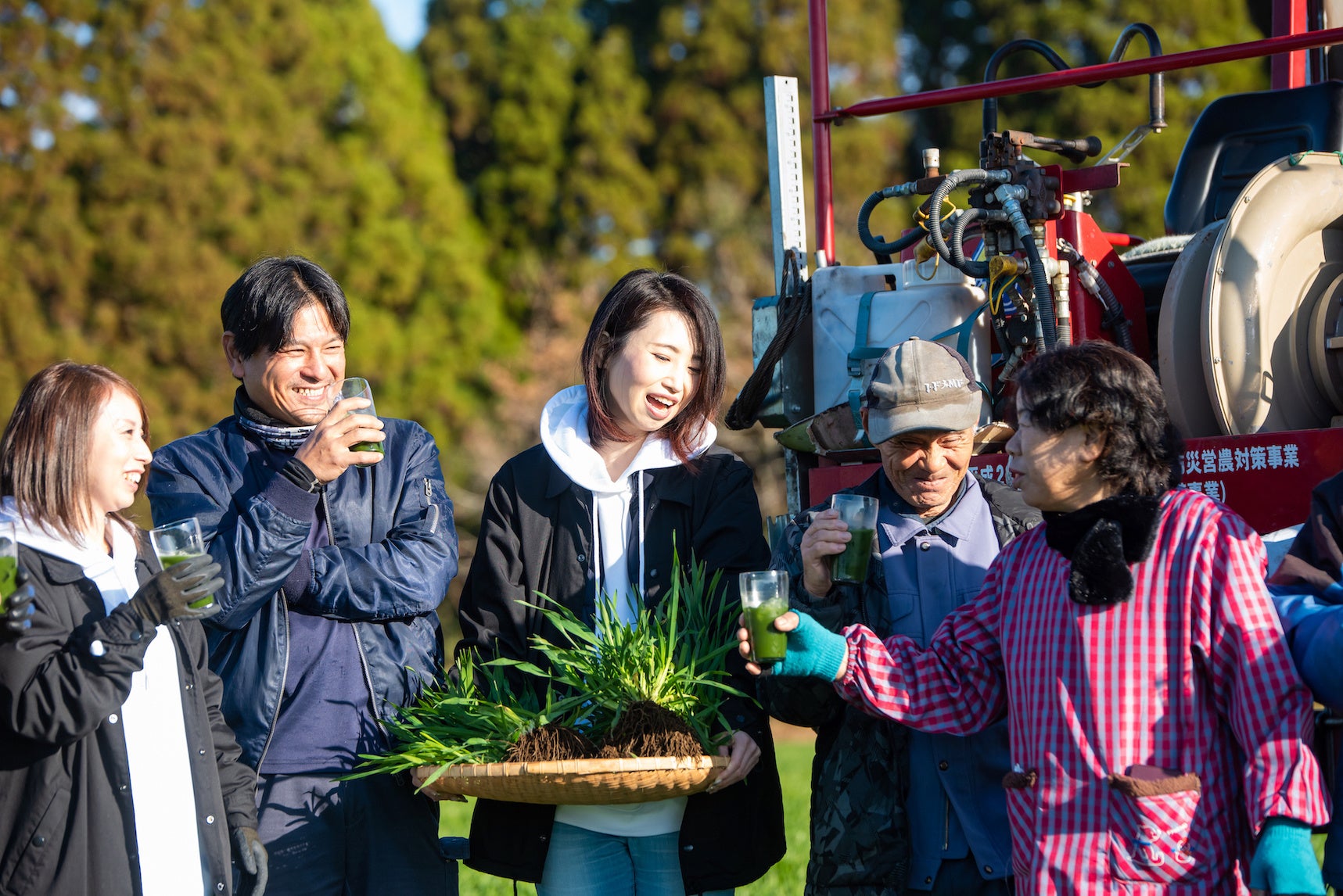 商品企画の段階で大麦若葉の生産地である鹿児島曽於市へ。九州地方の壮大な山と空による澄んだ空気と新鮮な風のもと、最高に良い環境の中で育て上げた原料を農家の方々と一緒に収穫作業を行い、私達のモットーである”絶対いいものを作るんだ!“という想いを形にしてきました。