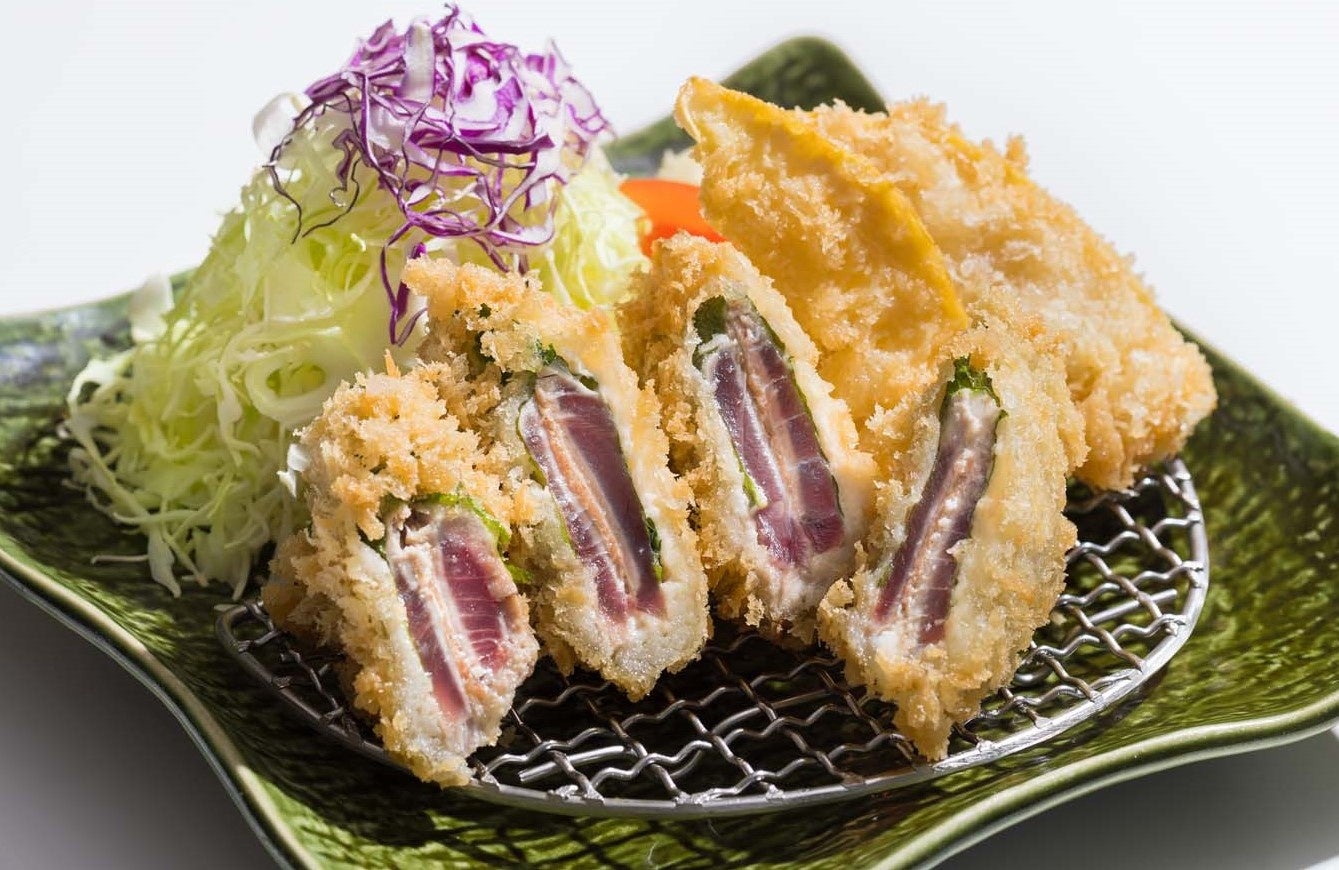 - かつおの梅はさみ揚げと鰹のたたき小丼