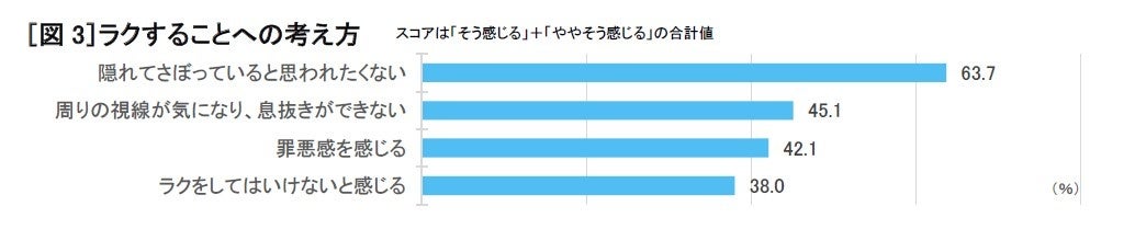 仕事やプライベートの区別なく自分の生活全般において、日々の生活でラクをすることに対して、どのように感じるか聞きました。すると、ラクをすることで6割が「隠れてさぼっていると思われたくない」(63.7%)と答えました。「ラクする=サボりと見られる」と考える人が6割もいます。また、ラクをすることは「周りの視線が気になり、息抜きができない」(45.1%)、ラクをすることで「罪悪感を感じる」(42.1%)と答えた人も4割超と少なくありません[図3]。「ラクをすることは良くないこと」という考え方にとらわれ、自分で自分をがんじがらめにしてしまっているようです。