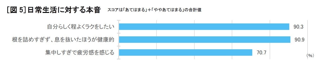 ラクすることは悪という考え方が主流となる中、日々の生活に対する本音を聞きました。すると、9割が「自分らしく程よくラクをしたい」(90.3%)、「根を詰めすぎず息を抜いたほうが健康的」(90.9%)と答えています。また、ラクすることを戒める日常のせいか、7割が「集中しすぎで疲労感を感じる」(70.7%)と答えています[図5]。