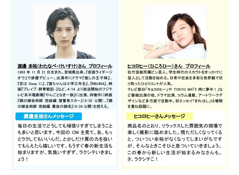 「日常生活に関する調査」から、現代人の多くはラクできていないという実態が明らかになりました。 その一端となっているのが仕事や家事をはじめとした、様々な日常生活のシーンにおける疲労感です。CMでは、「さ、ラクシテこ!」というキャッチフレーズを用いて、ラクできない日々に「ラクシテ」を取り入れて、秋ウコンエキスで日常生活での疲労感を軽減して欲しいというメッセージを表現しました。ドラマや映画で活躍中の渡邊圭祐さんと、バラエティを中心に活躍中のヒコロヒーさんという、まさに「ラクできない」