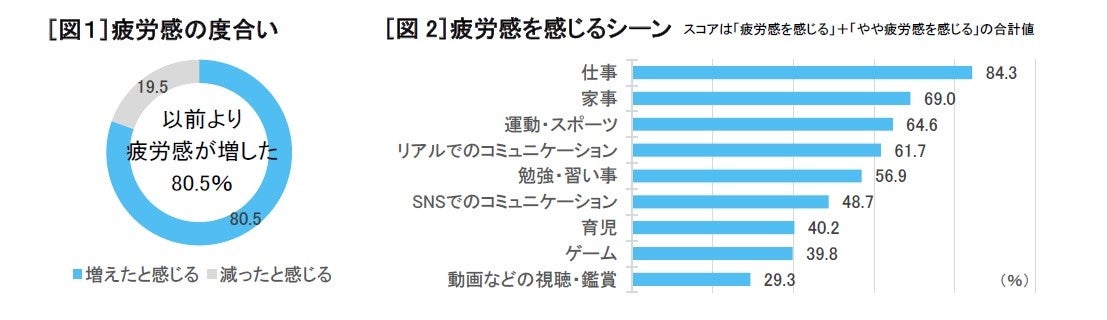 最近、疲労感を感じることが以前より増えたかと聞くと、8割が「疲労感が増した」(80.5%)と答えました[図1]。日常生活で疲労感を感じるシーンを聞くと、「仕事」(84.3%)が最も割合が高く、「家事」(69.0%)、「運動・スポーツ」(64.6%)の順となりました。また、6割は「リアルでのコミュニケーション」(61.7%)に、5割弱は「SNSでのコミュニケーション」(48.7%)に疲労感を感じています。SNSに加えゲームや動画視聴なども含めて、デジタルなライフスタイルも日常で疲労感を感じる要因の一つになっています[図2]。