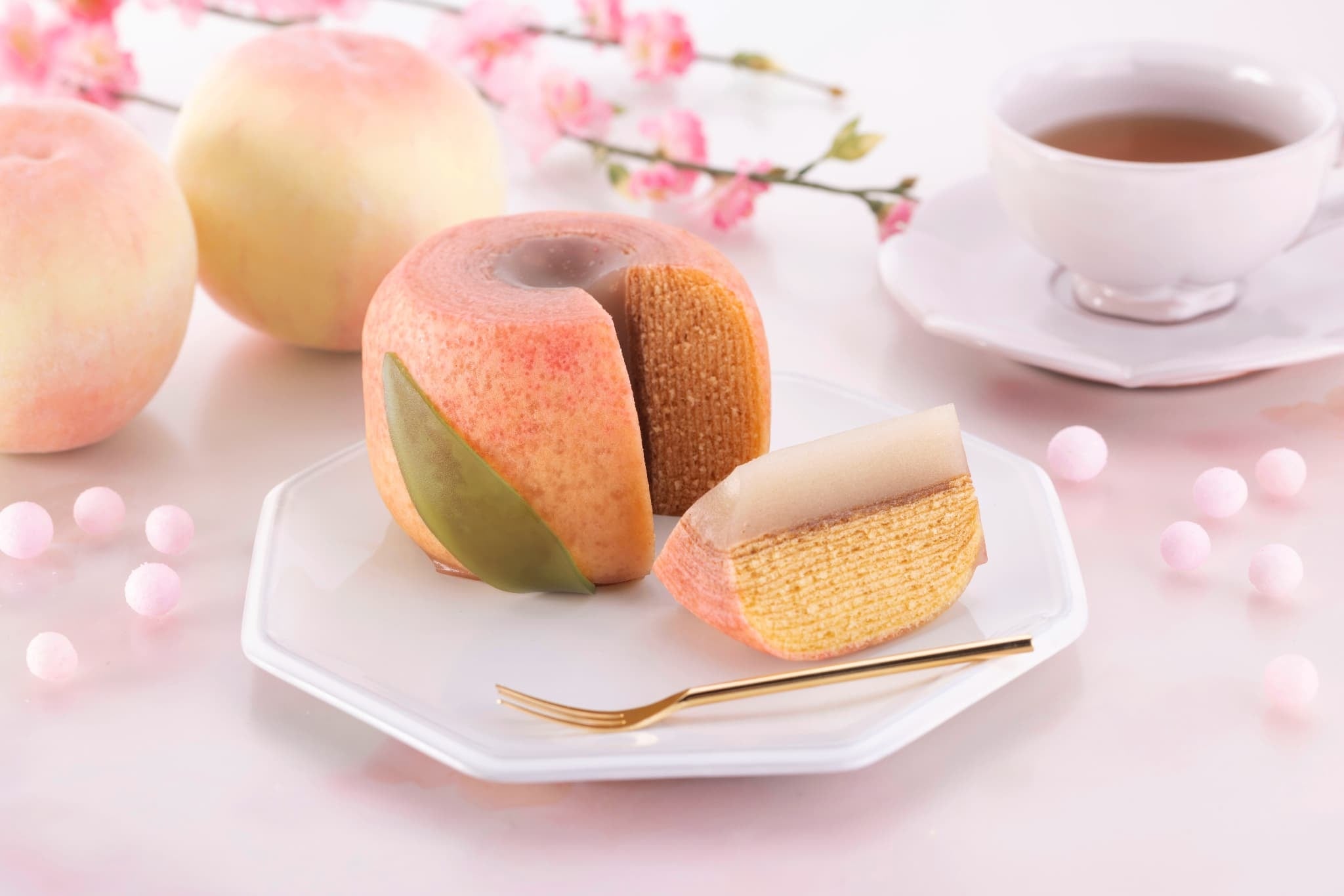 「まるっと幸せ桃ばうむ」は、ふわふわなバウムクーヘン生地と、白桃がしっかりと感じられるよう仕上げた桃のフルーツ羊羹を組合せた、あっさりと食べられる逸品。