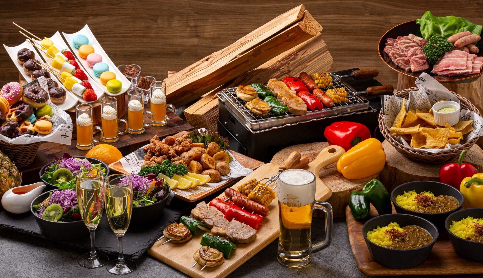 料理は毎年好評の“網焼きビーフ&ポーク食べ放題”のバーベキューに加え、豪快で食べ応え充分の“MIXグリルブロシェット”などビールやスパークリングワインと相性抜群の料理がセットメニューにラインナップ。また女性やお子様に人気のデザート食べ放題コーナーでは、ビアジョッキに見立てたマンゴーゼリー、カラフルなマカロンやドーナツなど、目でも舌でも楽しめるキュートでPOPなデザートを日替わりでご提供します。
