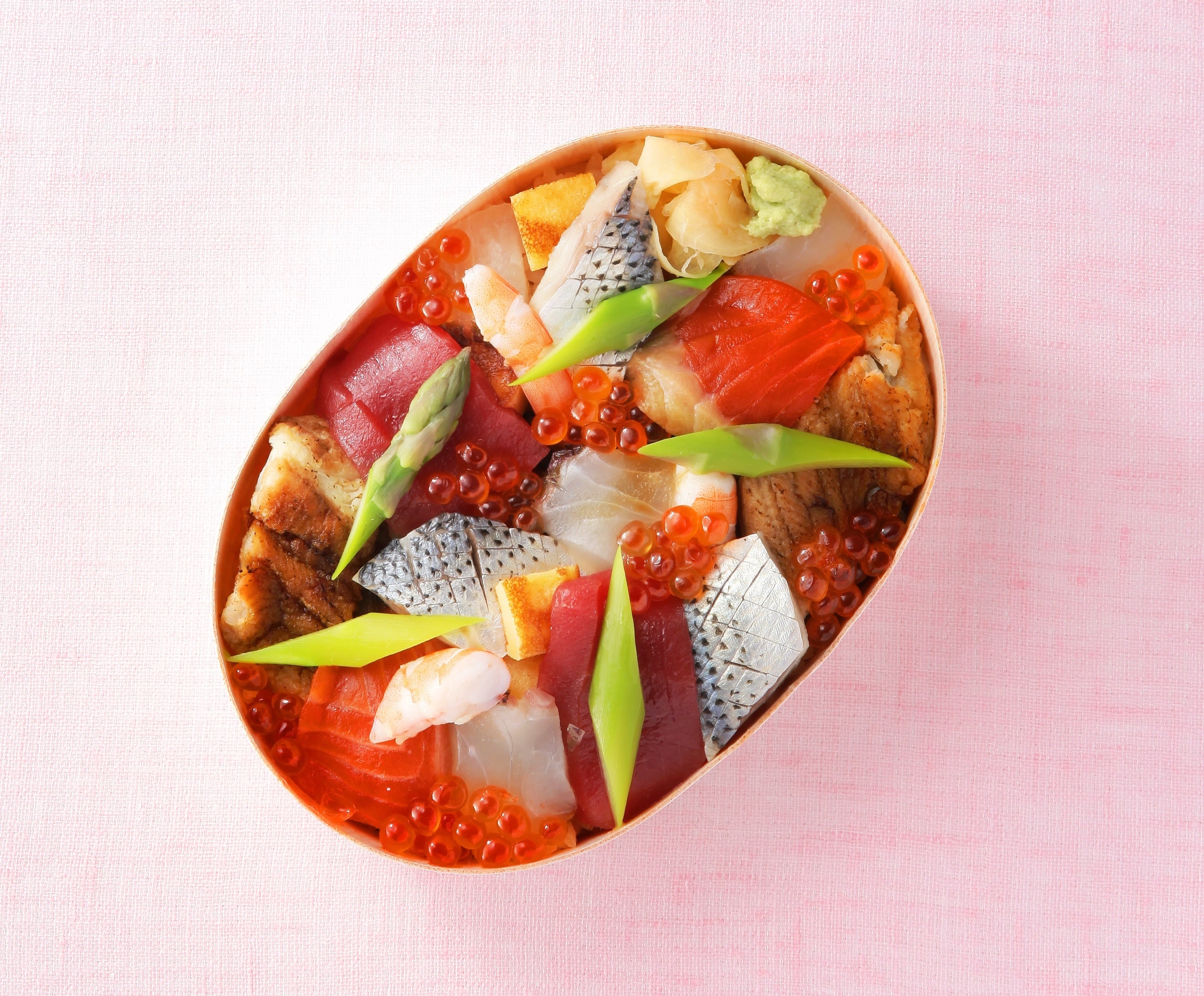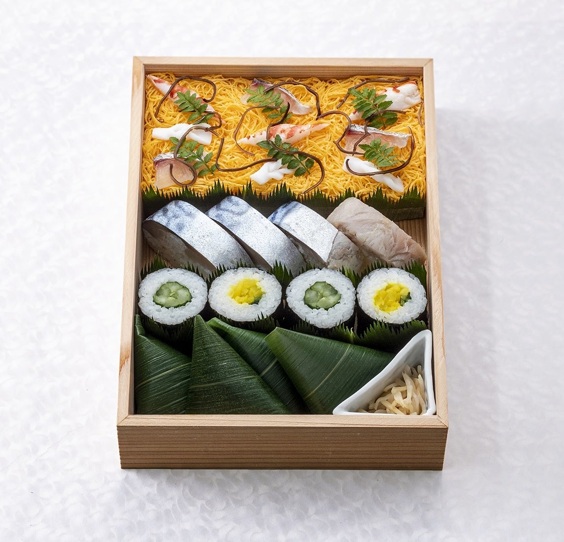 天明元年創業、日本近海の脂がのった真鯖を使った名物の鯖姿寿司や、美しい錦糸卵が春の野を思わせるちらし寿司などを盛合わせた贅沢な一品。