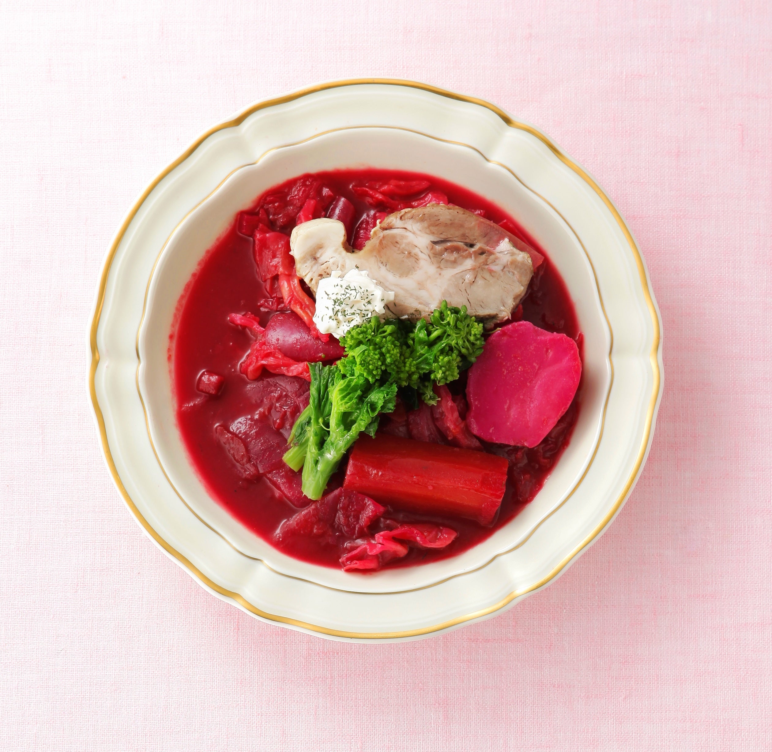 1951年の創業時に考案されたボルシチは大きめにカットされたビーツやキャベツがたっぷり。菜の花が春らしい彩りを添える限定メニューです。