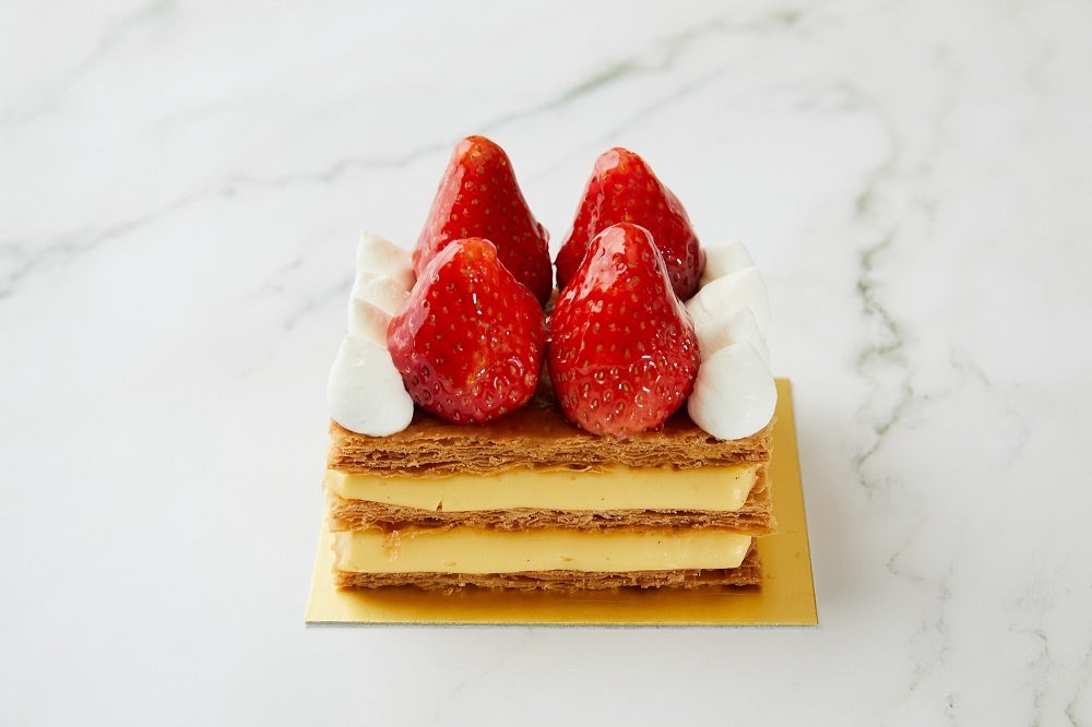 カスタードクリームをパイ生地ではさんだミルフイユに、大粒の国産いちごを贅沢にのせたナポレオンパイスタイルで。香ばしくパリパリ、ザクザクなパイ生地とジューシーないちごが混ざり合い、至福のおいしさが口いっぱいに広がります。