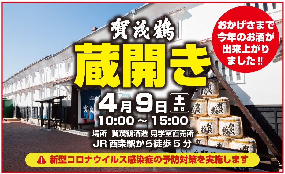 賀茂鶴酒造(株)(広島県東広島市西条、代表取締役社長:藤原昭典)は2022年4月9日(土)、「蔵開き」を開催します。見学室直売所では、先着200名様に酒粕(500g)を無料でプレゼント。