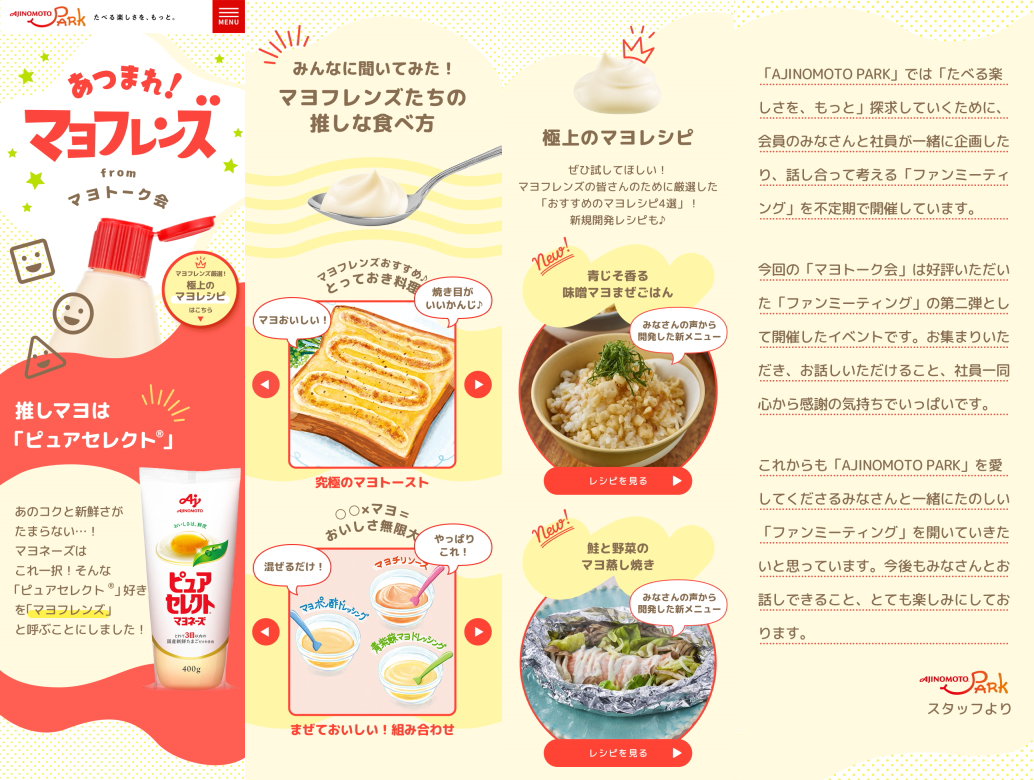 「AJINOMOTO PARK」では、今回のファンミーティングにご参加いただいたみなさまのアイデアをもとに、「ピュアセレクト®」マヨネーズをもっとおいしく、楽しく活用するテクニックや、レシピ情報を詰め込んだスペシャルサイトを作りました。ぜひご覧になってみてくださいね。