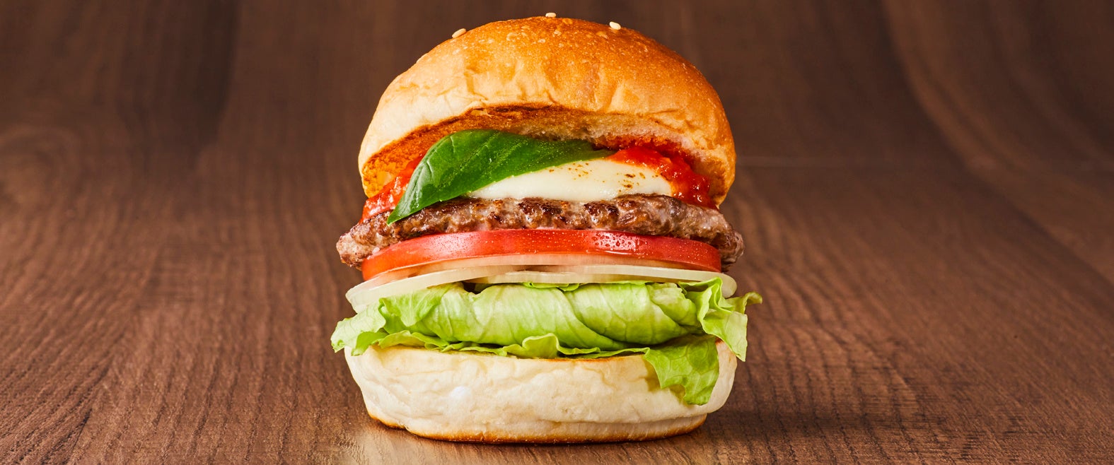 季節ごとに入れ替わるシーズンバーガーとして、モッツァレラチーズとフレッシュバジル、トマトソースをサンドした『モッツァレラチーズバーガー』をご用意いたしました。