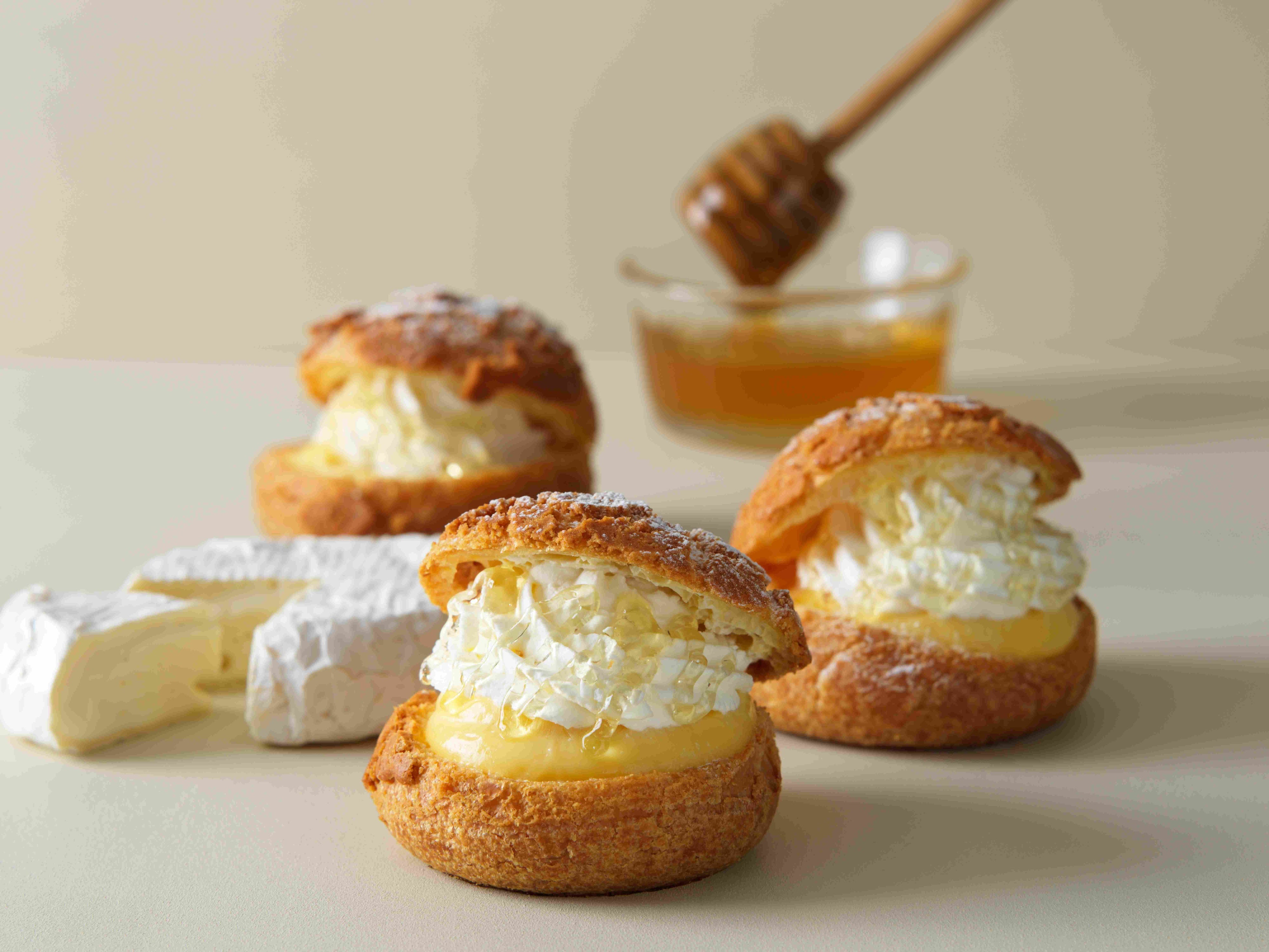 2種のチーズクリームをチーズクッキーシューでサンドしたツインチーズシュークリームです。一番人気のチーズクッキー「ゴーダ&チェダー」生地をシューと一緒に焼き上げ、カマンベールカスタードとあっさりとしたクリームチーズシャンティを絞りサンドし、はちみつジュレをトッピング。