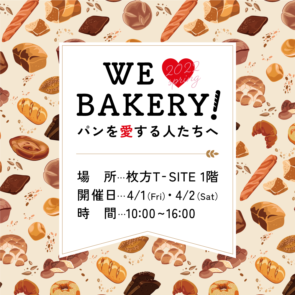 枚方T-SITE(大阪府枚方市、京阪電車「枚方市駅」南口より徒歩1分)では2022年4月1日(金)~4月2日(土)の2日間、パンイベント「WE ♥ BAKERY !」を開催致します!