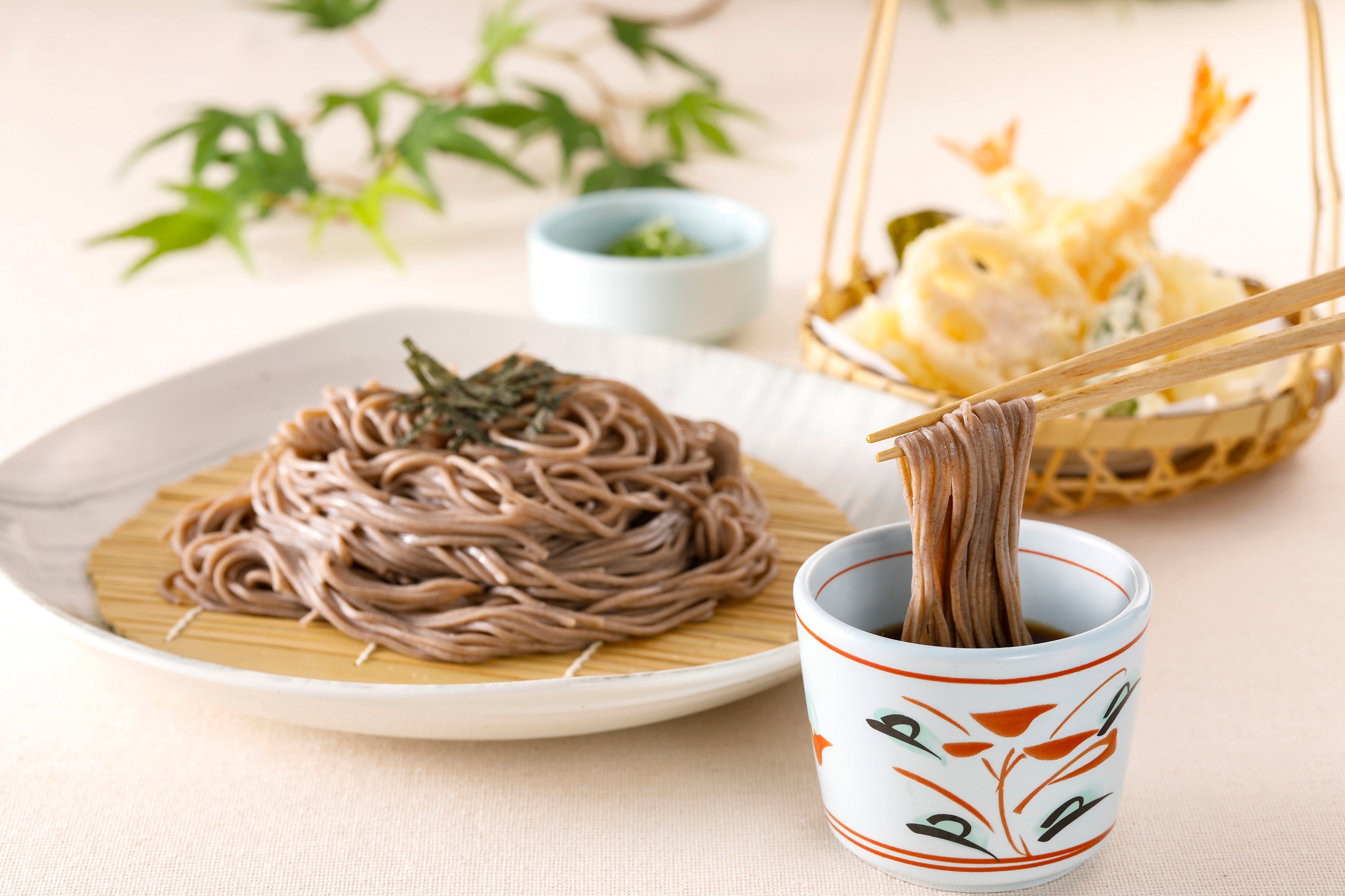 特製の「肉だし」で炊いたやわらかい牛肉とねぎがたっぷりのった、見た目にも食欲そそる冷たいおそばです。