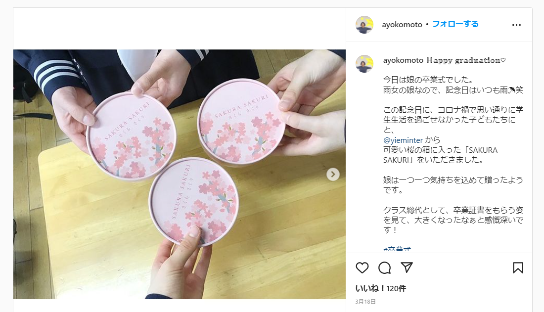 さくらの可愛らしいパッケージと共に身体にも優しいお菓子が、卒業生の皆さんの、この先の人生を応援するきっかけとなったことを、当社でもうれしく思います。