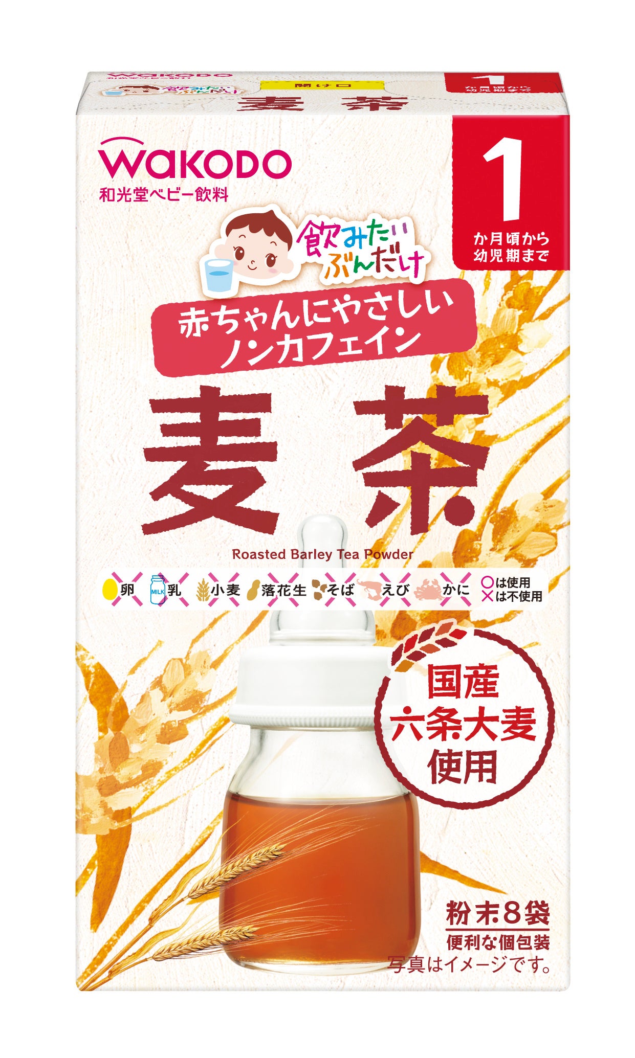 国産の六条大麦を使用した粉末飲料の麦茶です。1か月頃から幼児期までを対象にしています。お食事中やお出かけ先など毎日の水分補給にお使いいただけます。ノンカフェインです。