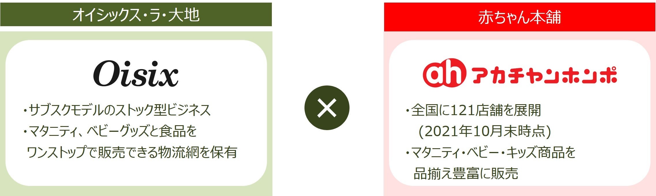 一方、赤ちゃん本舗は「スマイルな育児を。アカチャンホンポ」をコーポレートメッセージに掲げ、妊娠・出産・子育てにまつわる商品・情報・サービスなどを提供するとともに、「赤ちゃんのいる暮らし」を知りつくし、そこから見える社会課題の解決を通じて、安心して子どもを産み育てられる社会の実現を目指しております。赤ちゃん本舗が運営するアカチャンホンポは、全国に約120店舗を展開(2022年3月末時点)しています。このような状況の下、両社のアセットを活用したサービス展開を前提とした協業の検討を昨年11月より開始しました。