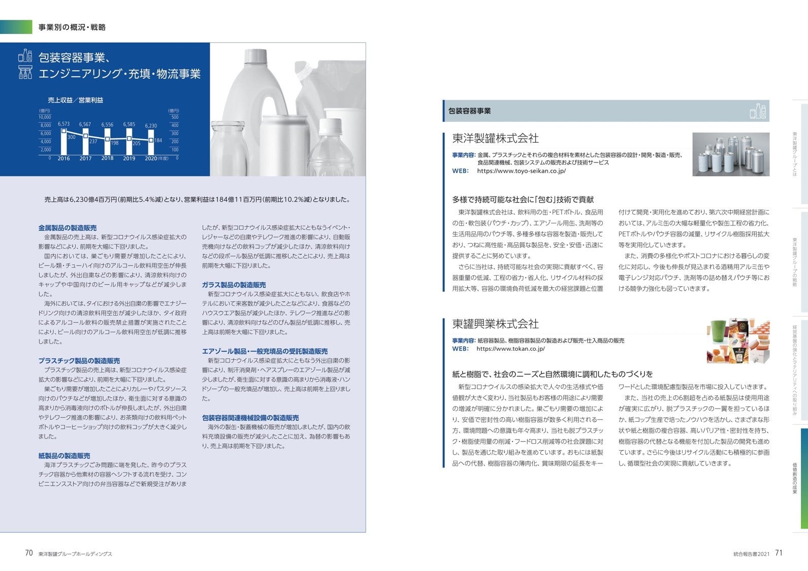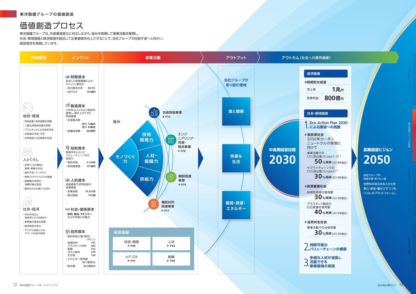 当社グループは「中期経営計画2025」において、持続的成長のためのロードマップを示しており、包装容器領域を基盤として、エンジニアリング・充填・物流領域におけるバリューチェーンの拡大と、鋼板関連事業における電池向け部材や機能材料関連事業における光学用部材等での成長を図るとともに、新規事業領域において社会課題解決に向けた新しい仕組みを創出していきます。本章では、これらの事業について、価値創造の戦略・成果の概況をご報告します。