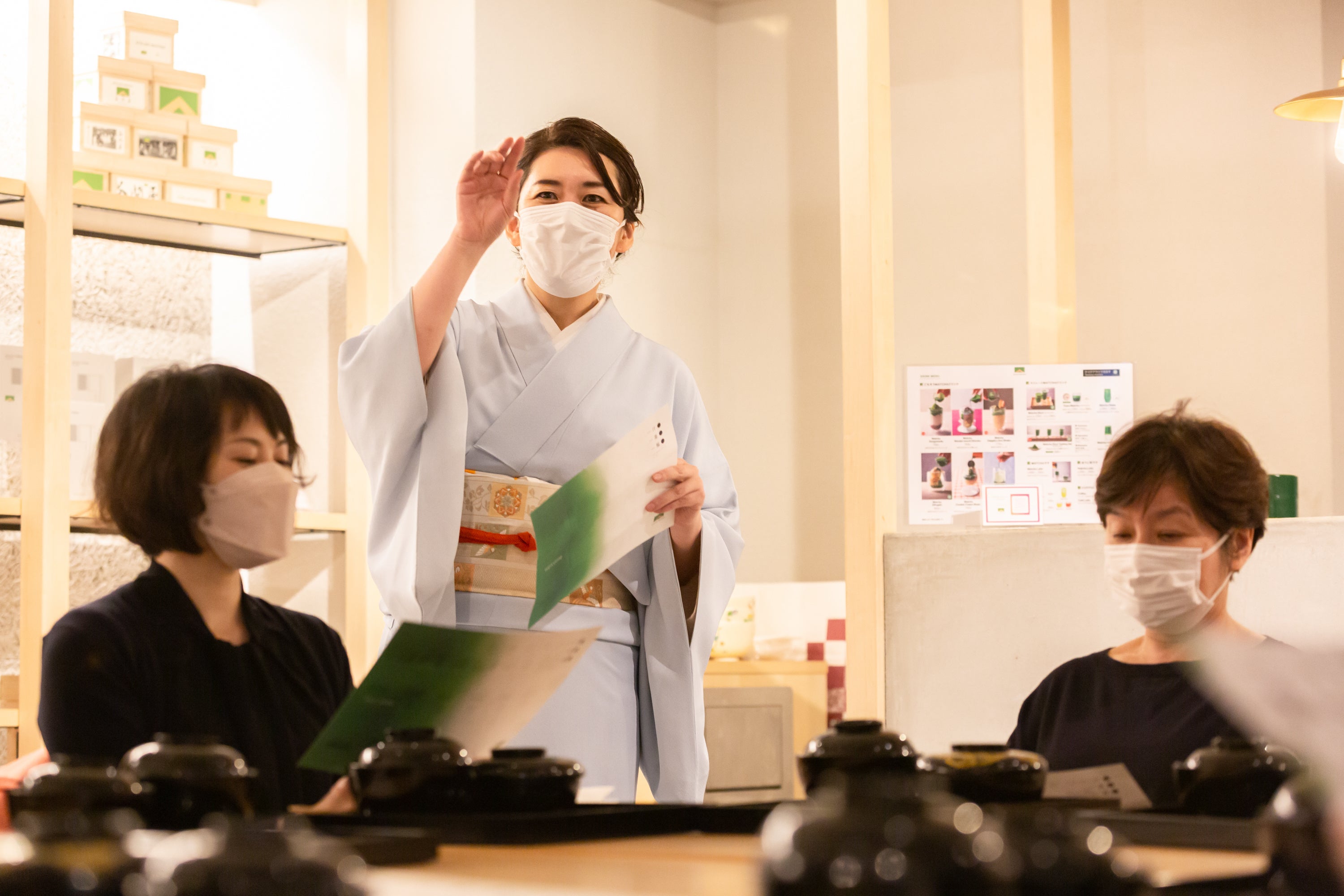 本ワークショップは、服装は着物でなくてもOK、椅子席での開催のため正座の心配も不要というカジュアルなスタイルで体験いただける一方、本格的な懐石道具を使い、本来であれば 4 時間ほどかかる 茶事の最初と最後のパートだけを90分で体験いただく「ミニマム茶懐石」スタイルを参加者の方々は新鮮な驚きを感じながらも大変楽しく堪能いただきました。