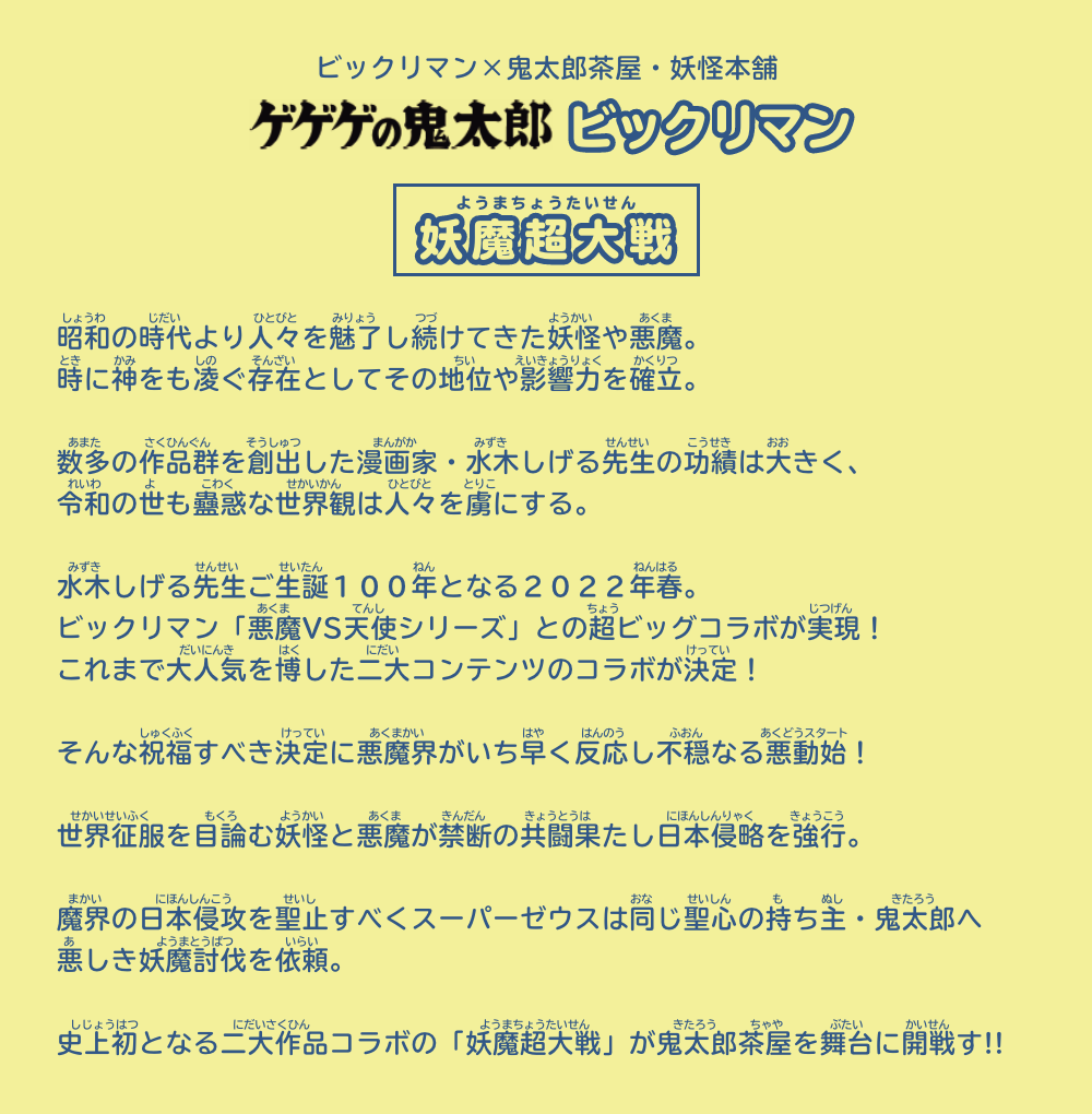 株式会社ロッテは、ゲゲゲの鬼太郎漫画家・水木しげる生誕100周年記念×ビックリマン生誕45周年を記念し、昭和から愛され続けるゲゲゲの鬼太郎とビックリマンの禁断の初コラボレーションが決定したことを発表します。続報発表を楽しみにご期待ください!※鬼太郎茶屋にて実施予定