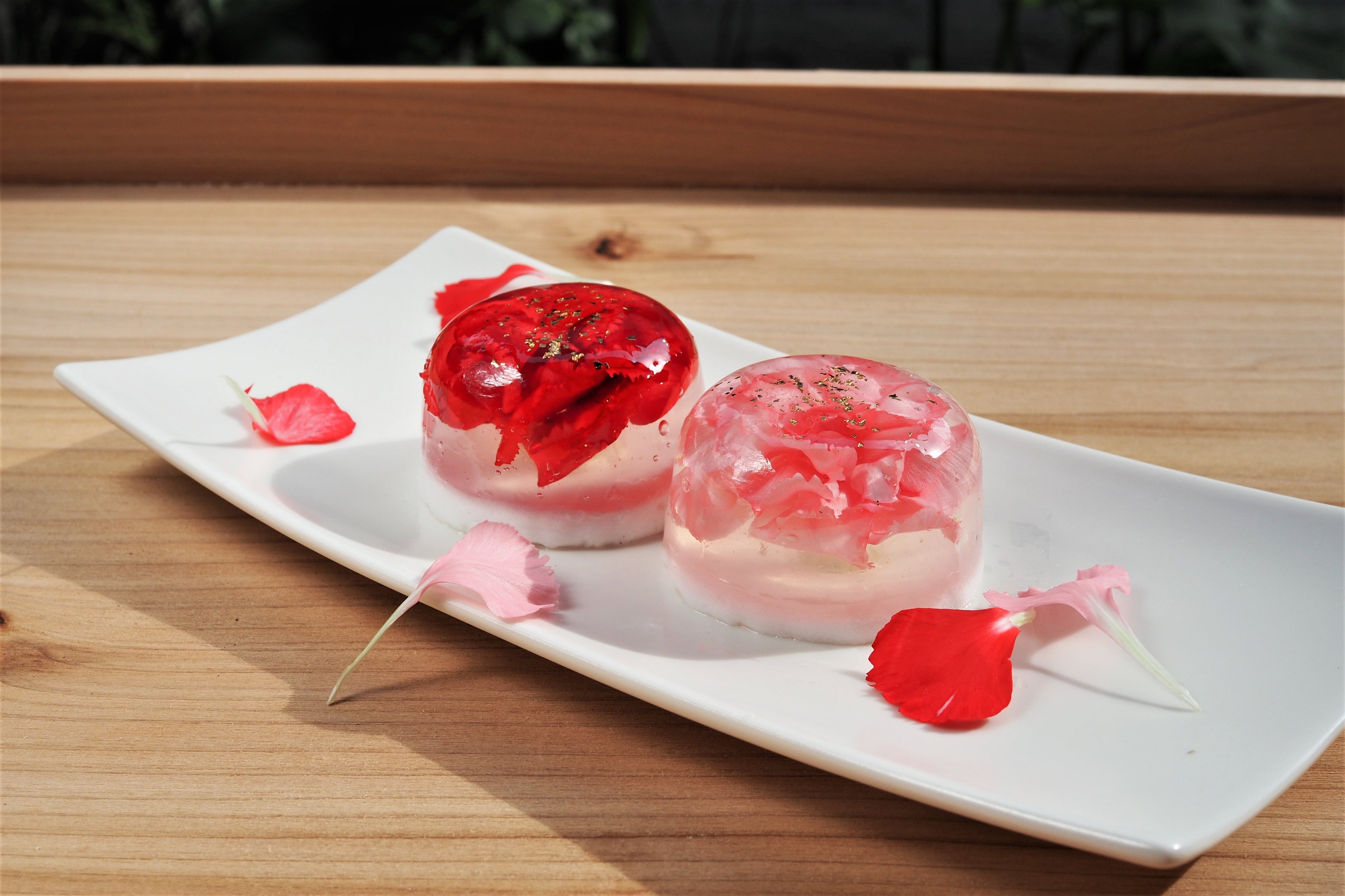 開発した【カーネーション】は専用カップに錦玉羹(寒天に砂糖を入れて固めたもの)を流し、カーネーションを花が咲くように一輪ずつ丁寧に広げました。真っ白な浮島生地を土台にしてカーネーションが浮き目立つように工夫をしました。食べるとカーネーションの花はほのかなバラの香りがする、上品な味わいになっています。