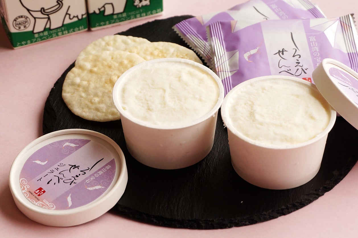 「富山湾の宝石」と呼ばれるしろえびと富山米を使用してサックリと焼き上げた新発売の「しろえびかきもち」、人気のしろえびせんべいの関連商品を詰め合わせた「しろえびせんべい袋」、しろえびせんべいのほのかな香りと濃厚なミルクが特徴の「しろえびせんべいジェラート」を販売いたします。