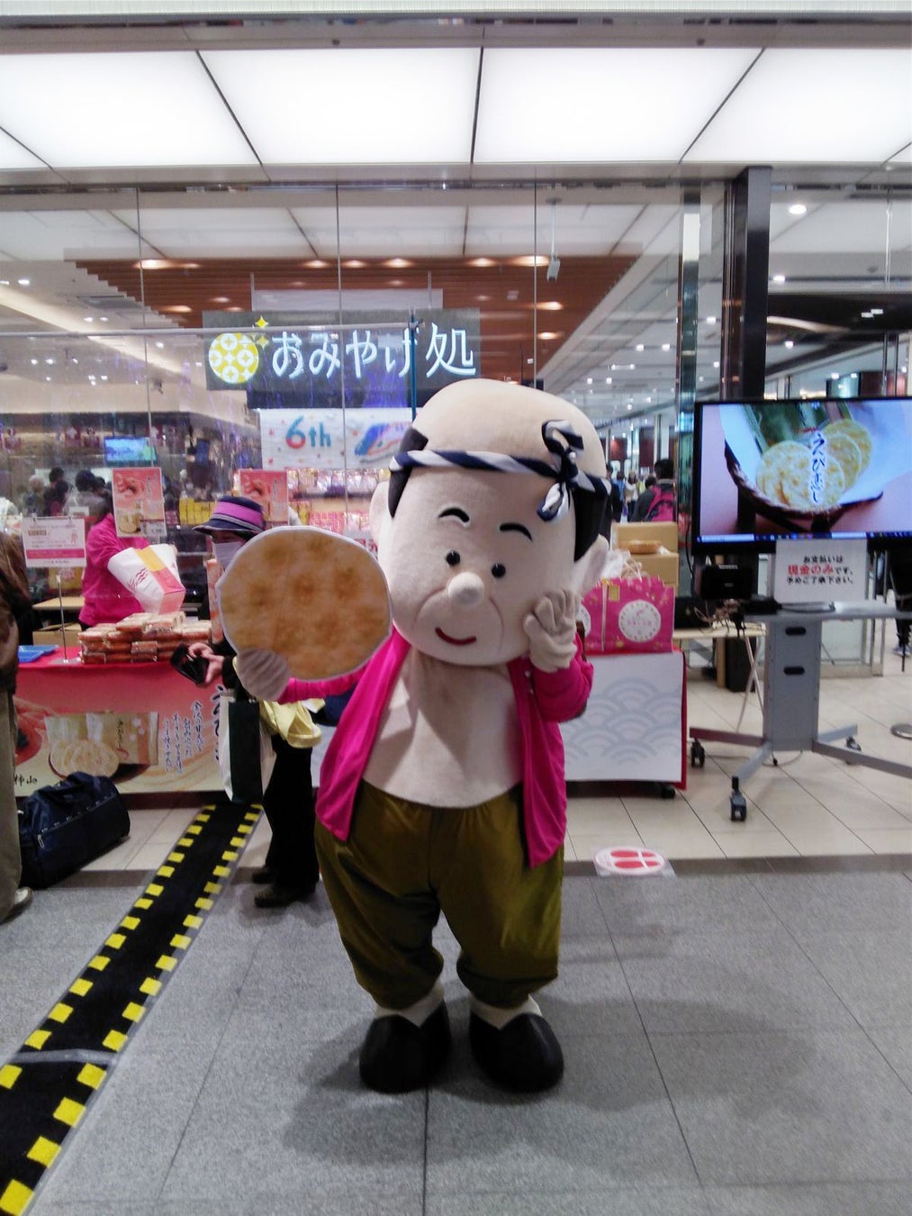 出店開催中は午前10時~午後5時までしろえびかきもちの試食用サンプルの配布を行い、午前10時と午後3時の時間帯には当社のおじさん系職人マスコットの「柿兵衛(かきべい)」も登場します。