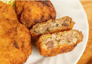 材料:キャベツ・合い挽き肉(牛・豚)・玉ねぎ・ナツメグ・塩・コショウ・酒・オリーブオイル・自家製コンソメ・小麦粉・パン粉・卵・揚げ油(サラダ油)