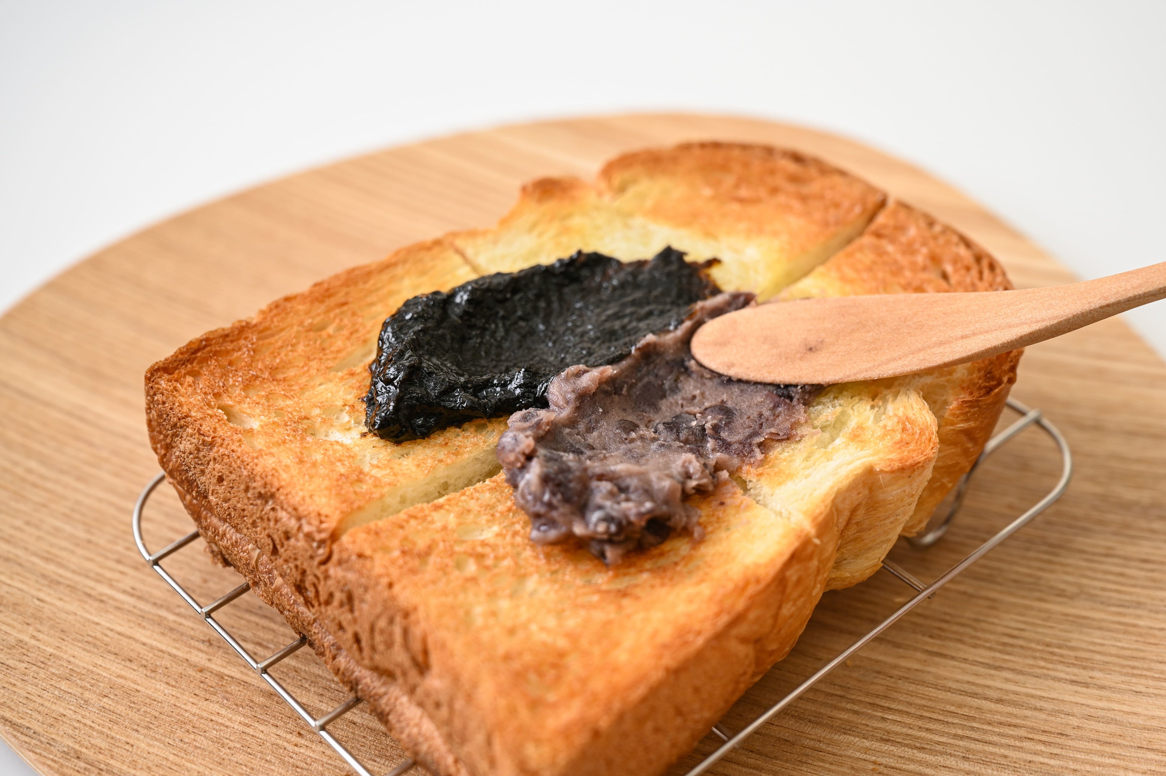 世界20か国以上に店舗展開するブーランジェリー メゾンカイザーの山型食パンにカルピスバターをのせて、スチームトースターで焼き上げたサクッとした食感のトーストに、老舗海苔店 山本海苔店の甘じょっぱい海苔佃煮「むろまち」と榮太樓總本鋪のつぶしあんをお好みのバランスで塗ってお楽しみいただく一品です。佃煮には隠し味として「みつあめ 有平糖」を加え、トーストと相性のいい味に仕立てました。