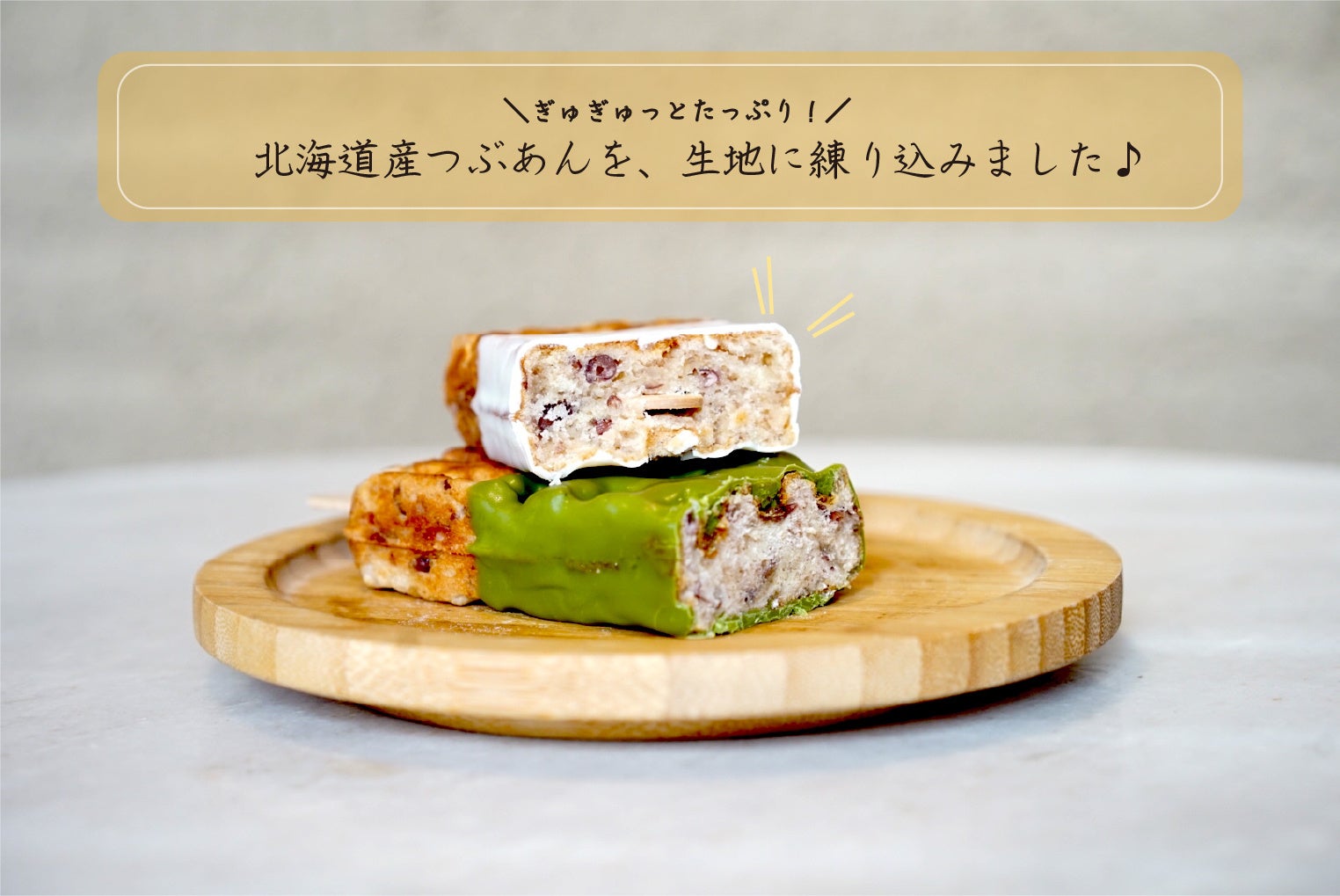 ワッフルの生地に粒あんを贅沢に練りこみ、抹茶やホワイトチョコをディップ!