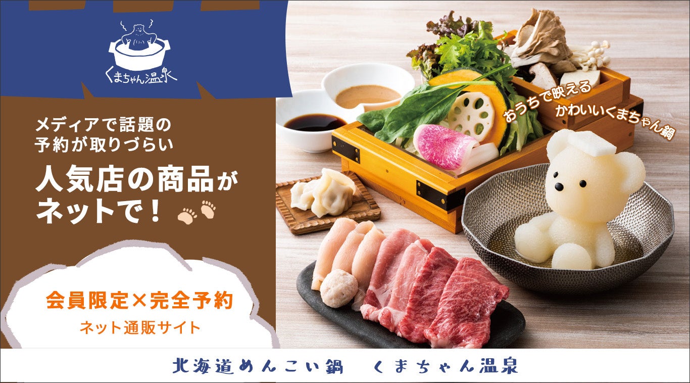 「北海道めんこい鍋 くまちゃん温泉」(運営:株式会社イートアンドインターナショナル)は、温泉に浸かっているような“くまちゃん”(食物繊維とコラーゲンで固めた出汁)のかわいさで人気の、札幌発 “かわいい!(めんこい)一人鍋専門店”です。現在、2021年12月にオープンした渋谷宮益坂店の国内1店舗のみで、連日満席、予約は常に1か月待ちと大人気。そんな「北海道めんこい鍋 くまちゃん温泉」のオンラインショップが2022年4月1日(金)にリニューアルし、よりかわいく、便利に生まれ変わりました。