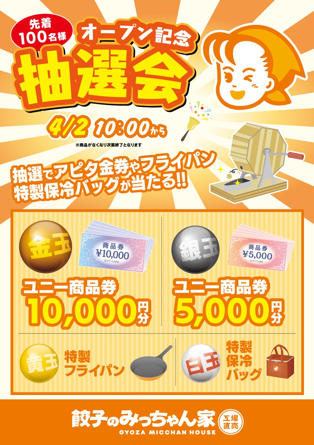 ▼概要:けやきウォークの自動販売機にて餃子をご購入いただくとその場で最大10,000円のギフト券が当たる抽選にご参加いただけます。